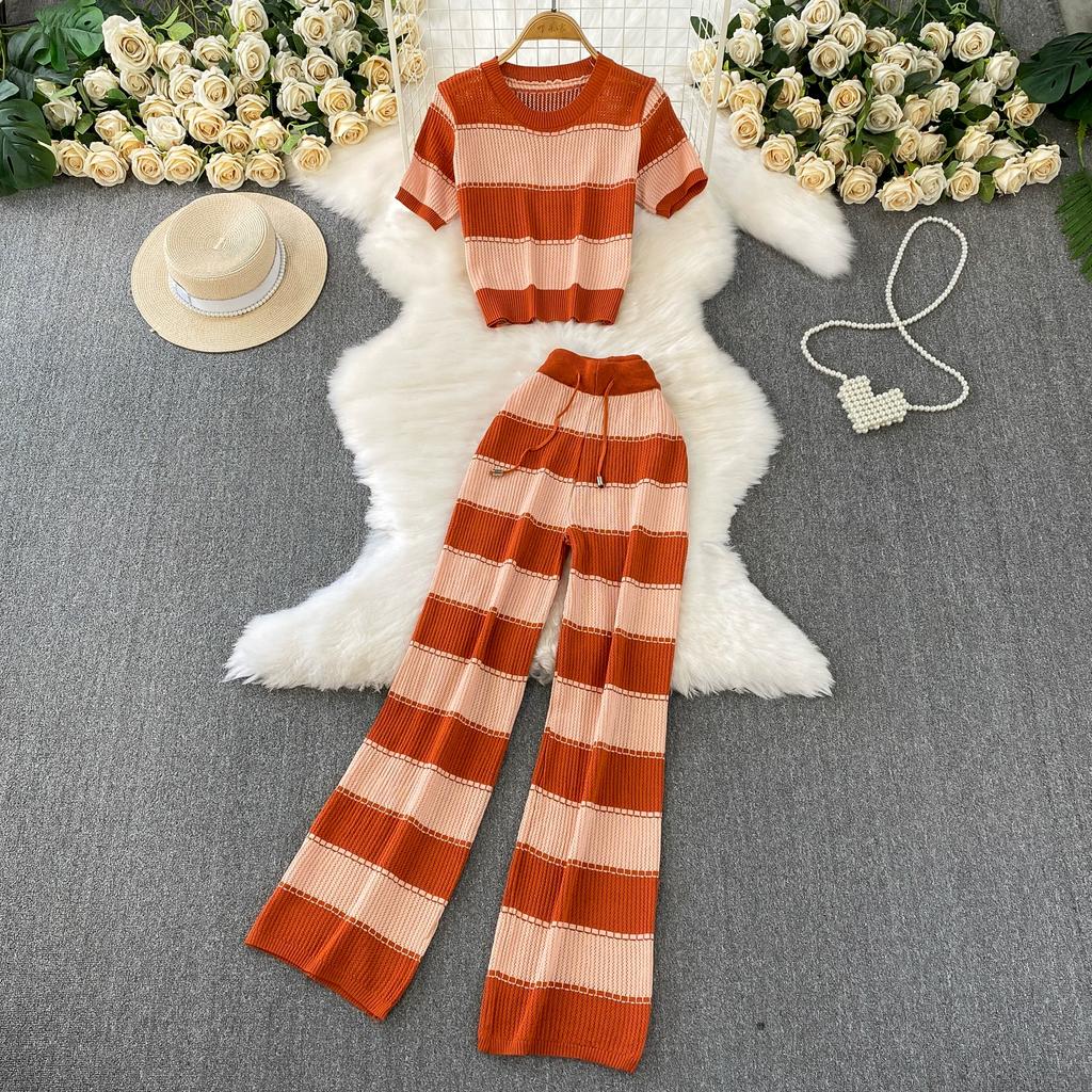 Летний женский шикарный полосатый вязаный свитер и брюки, комплект из двух предметов, пуловер с коротким рукавом и костюм с широкими брюками — купить товар онлайн с бесплатной доставкой по всему миру!