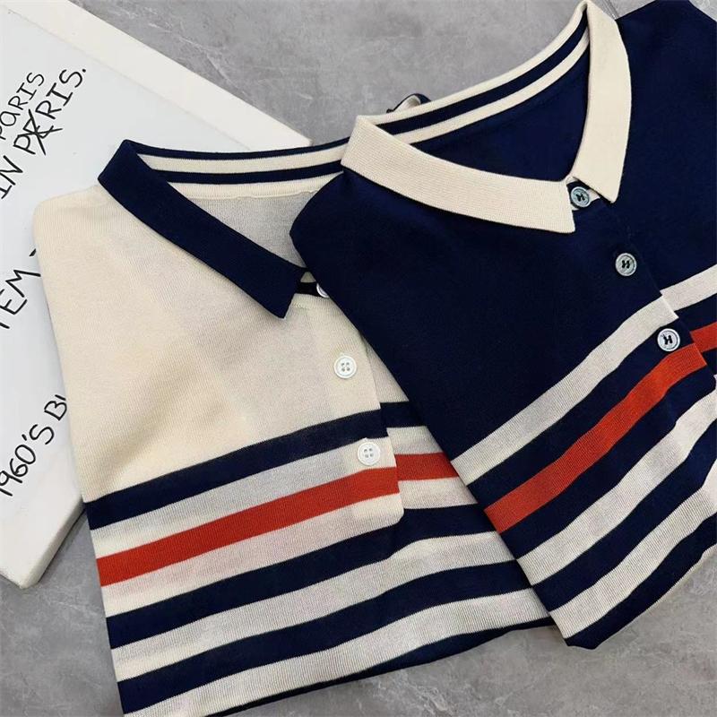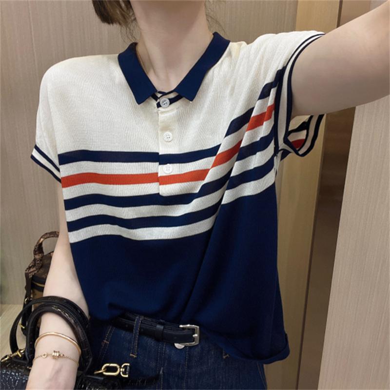 Женская одежда Летняя трендовая полосатая футболка с трикотажным верхом из ледяного шелка с воротником поло Элегантная простая повседневная с коротким рукавом Свободные пуловеры