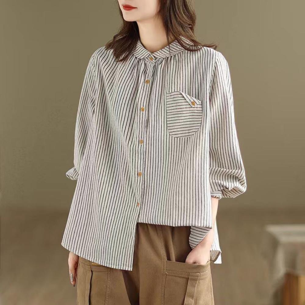 Весенне-осенняя хлопково-льняная полосатая рубашка с длинным рукавом из чистого хлопка, художественный топ