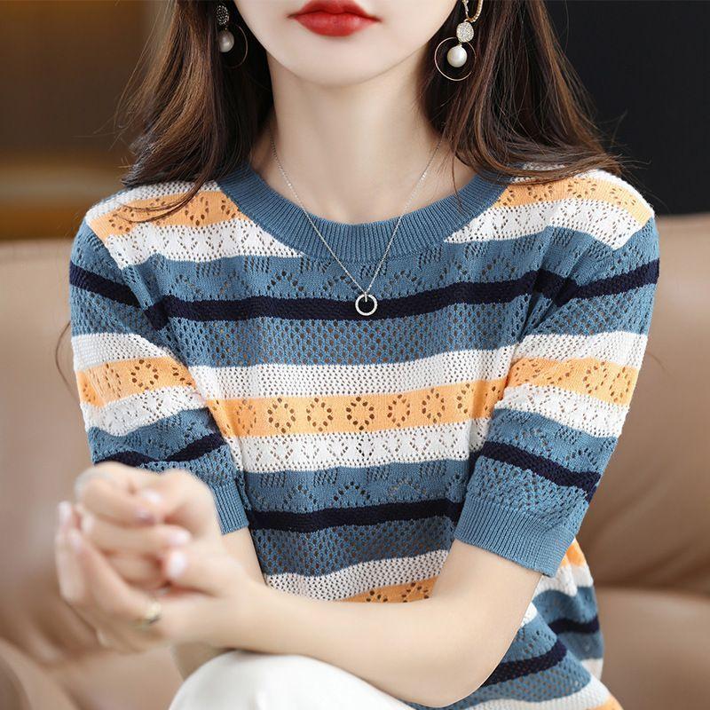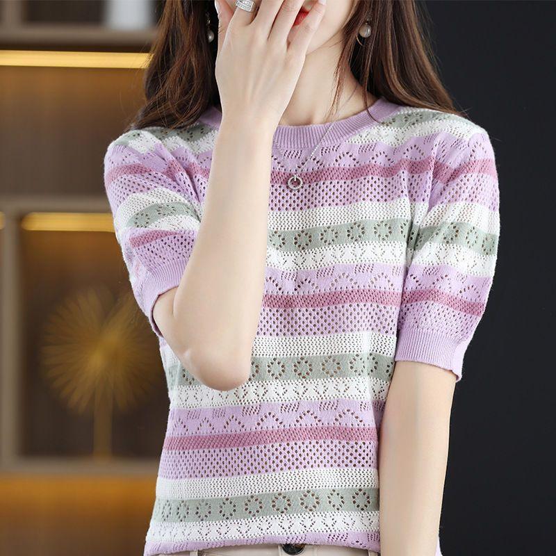 Лето 2024 Новая Тонкая Модная Футболка с Коротким Рукавом в Полоску с Круглым Вырезом для Повседневной Носки Свободный Ажурный Свободный Свитер Вязаная Футболка Женские Топы