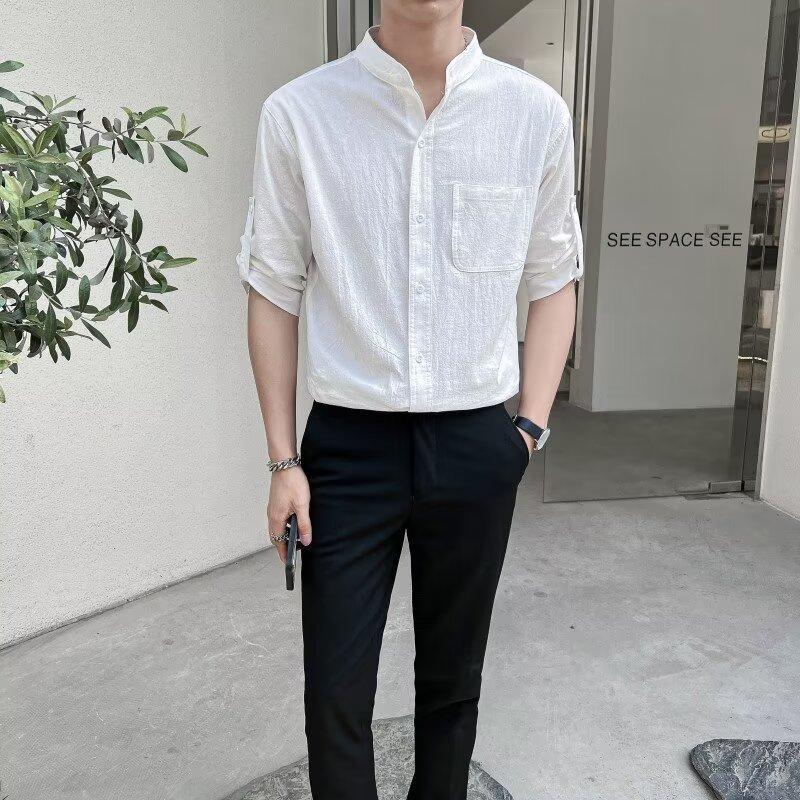 Высококачественная ткань, не требующая глажки, с эффектом «мятой волны», тонкая рубашка с воротником-стойкой, мужская футболка с коротким рукавом и круглым вырезом