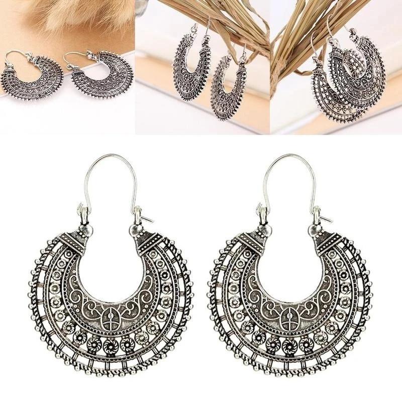 Серьги-кольца в этническом племенном ацтекском стиле хиппи в стиле бохо болтаются в серебряном тибетском стиле