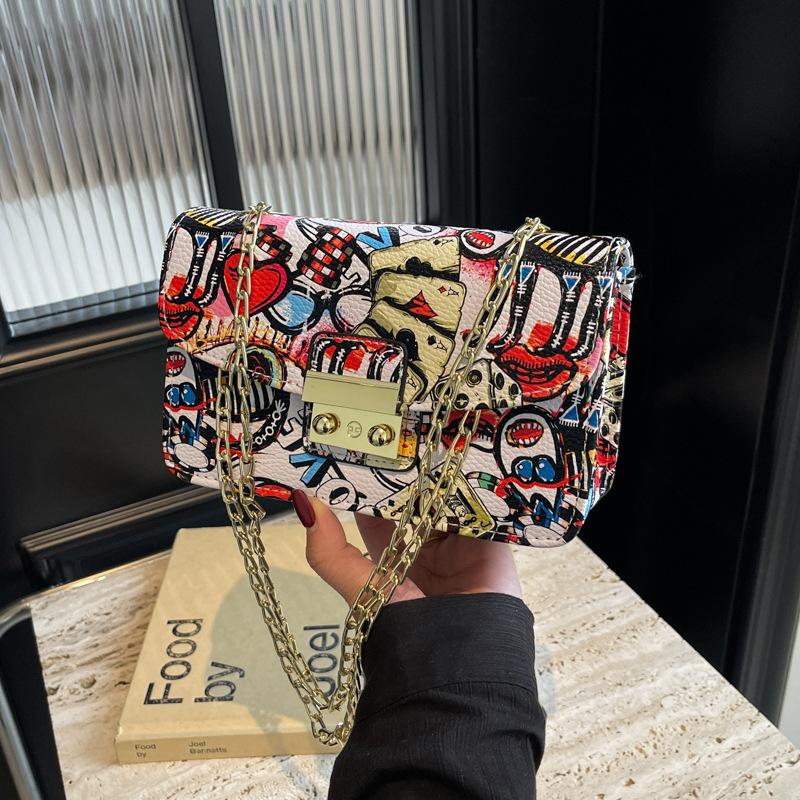 Граффити маленькая сумка лето 2025 новая корейская версия модный тренд Xiaohongshu женская цепочка кроссбоди маленькая квадратная сумка pu