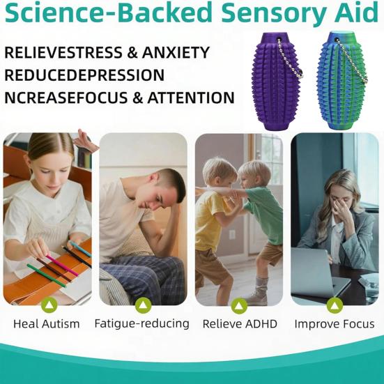 Сенсорное облегчение тревоги: Управляйте стрессом и тревогой с помощью этого колючего тактильного брелка-стимулятора, разработанного в форме ролика и с крошечными шипами для успокаивающего тактильного опыта в напряженных ситуациях.