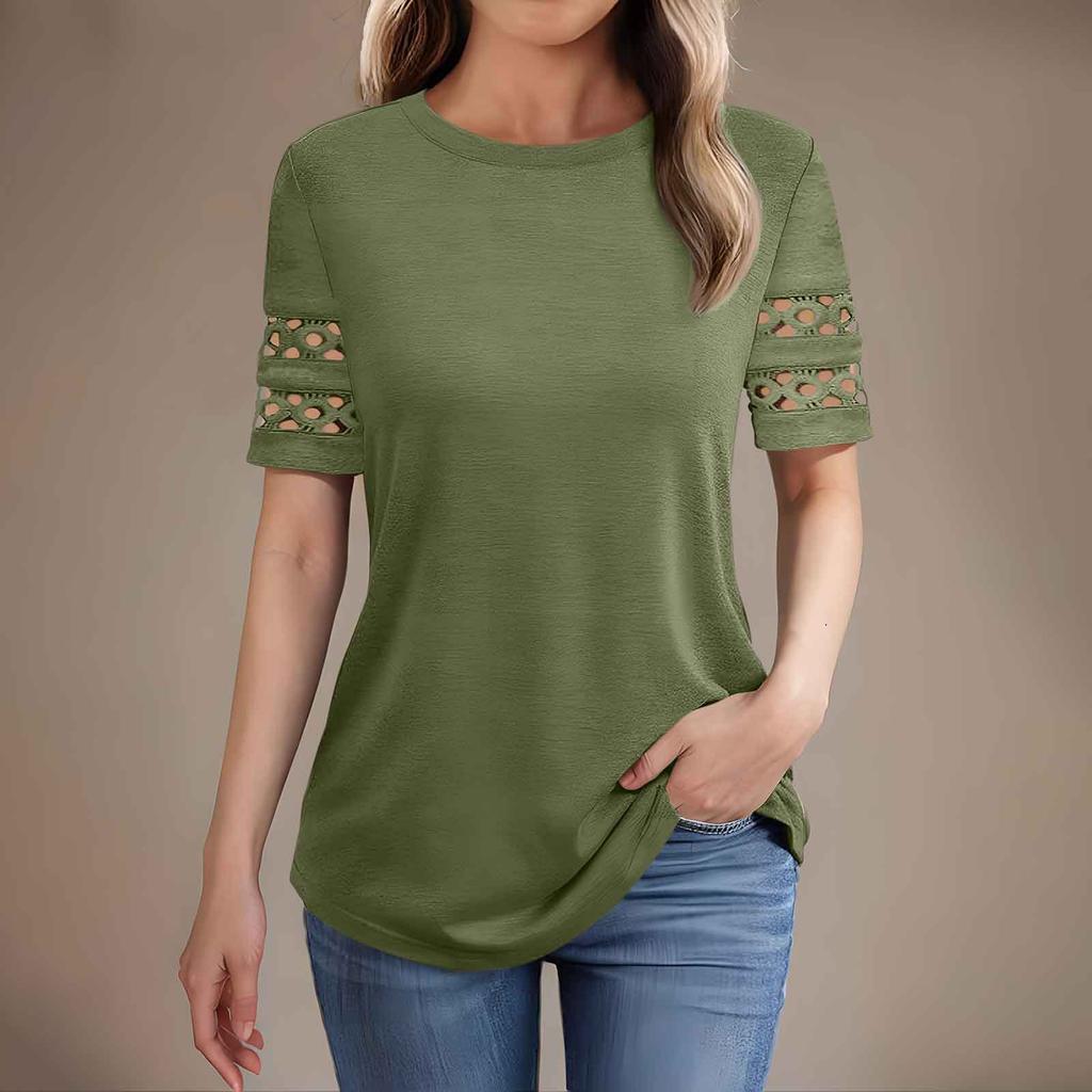 Женская летняя новая футболка с коротким рукавом и кружевной вставкой, топ с круглым вырезом