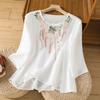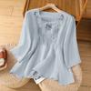 Ретро футболка с круглым вырезом из хлопка и льна с вышивкой для женщин на лето Новая свободная и элегантная темпераментная футболка с рукавом пять четвертей