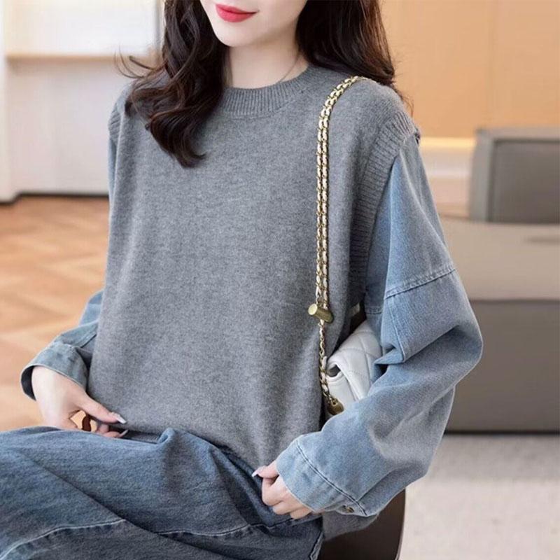 Новая осенне-зимняя мода, корейская версия, трикотажный женский свитер с рукавами из денима, имитация двойки, круглый вырез, универсальный, свободного кроя