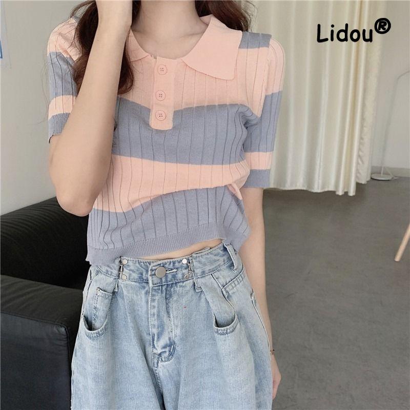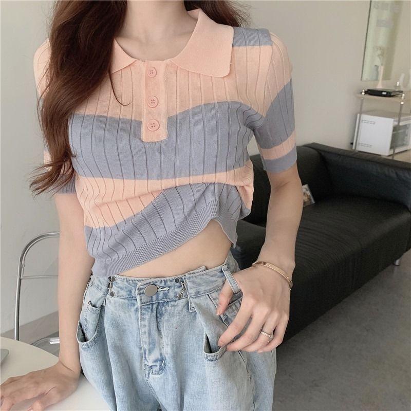 Модная контрастная полосатая вязаная футболка на пуговицах для женщин, короткая, с внутренней подкладкой, классическим воротником поло, высокой талией, универсальный топ