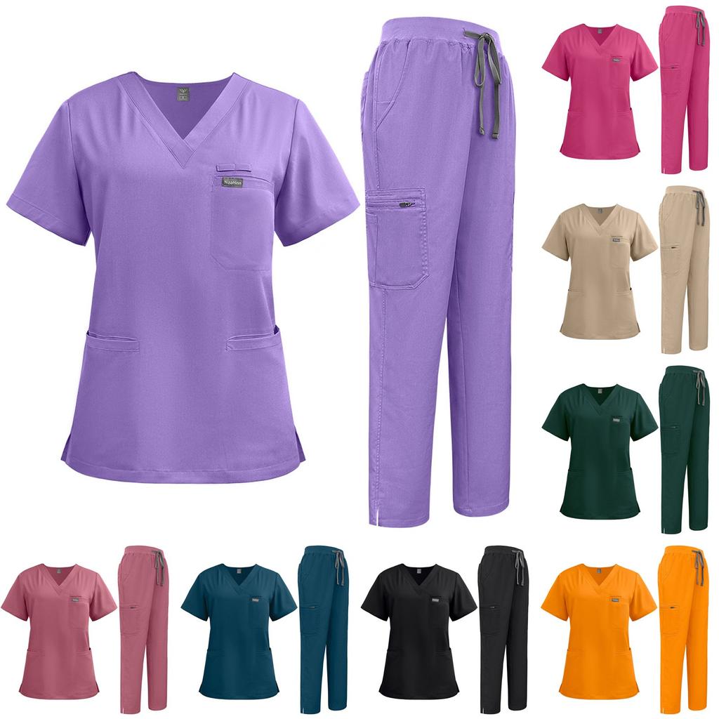 Женский однотонный топ с короткими рукавами и V-образным вырезом, карманами, рабочая одежда, комплект из двух предметов — купить товар онлайн с бесплатной доставкой по всему миру!