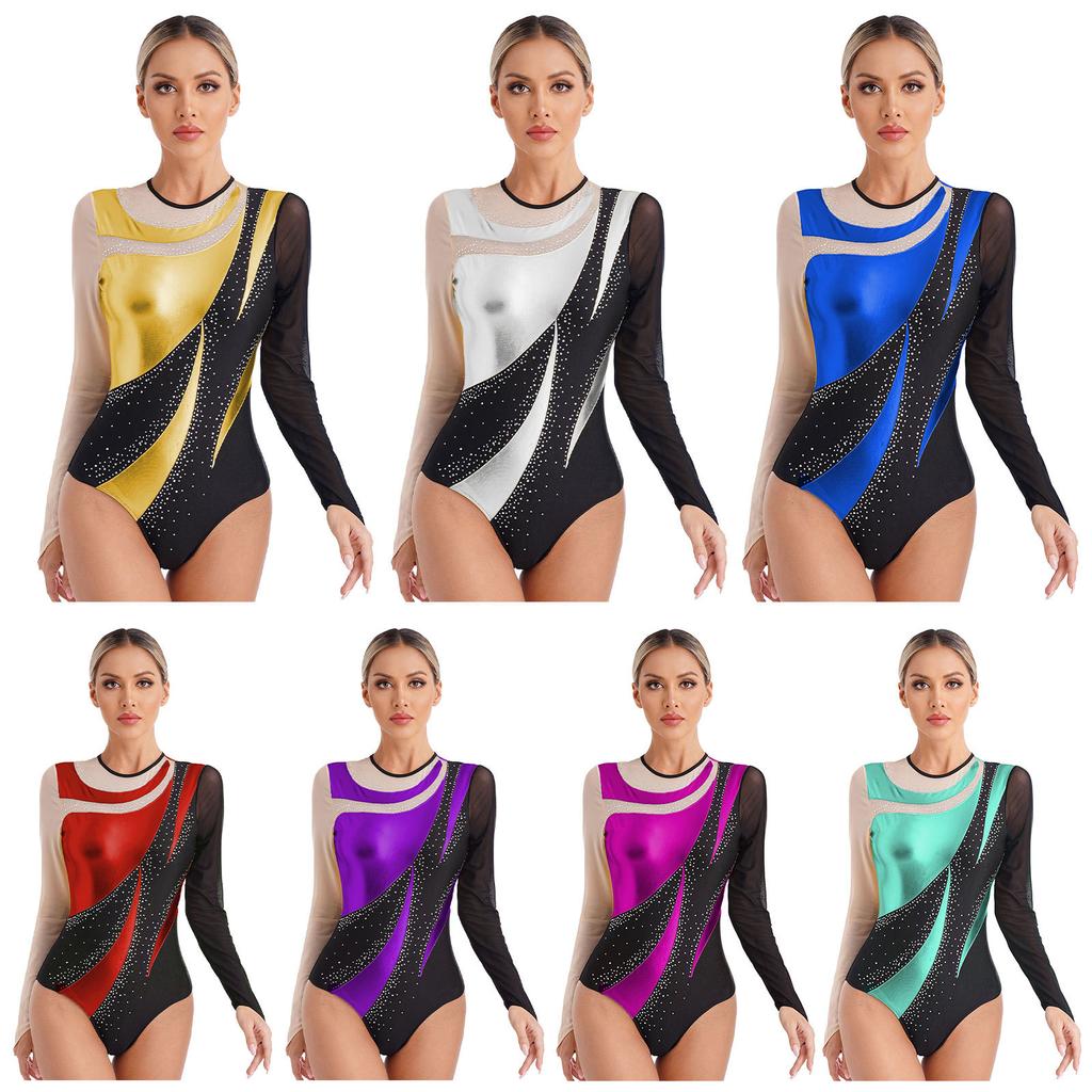 Женский купальник для балета, гимнастики, фигурного катания, йоги, с длинным рукавом, металлик, контрастного цвета, танцевальная одежда
