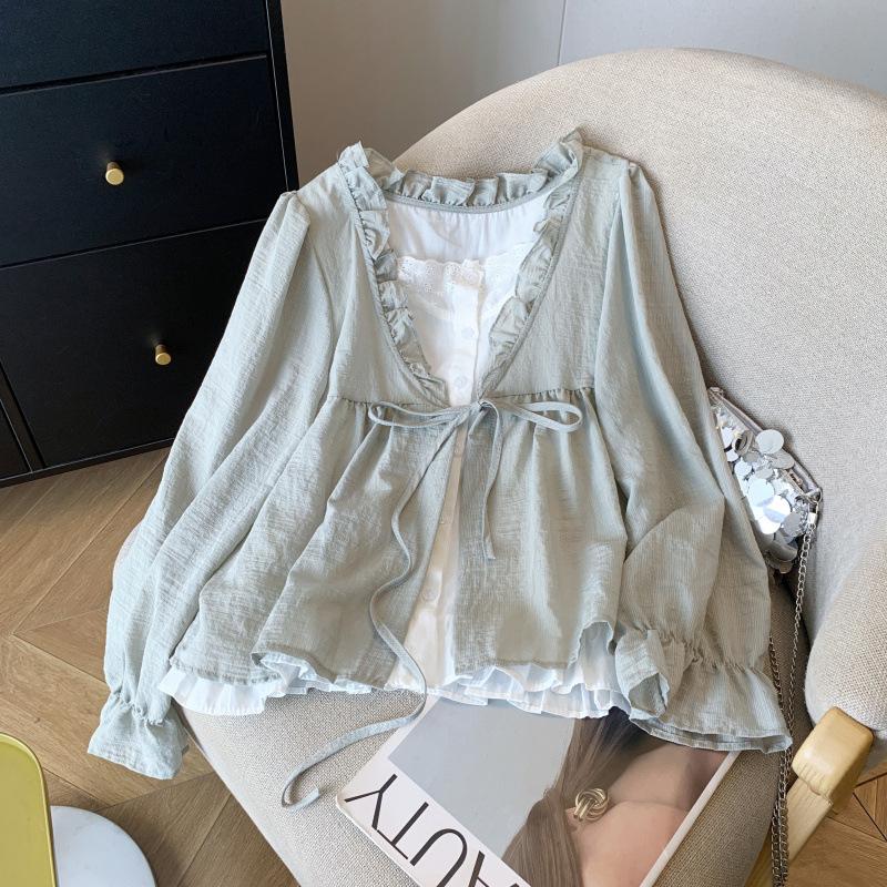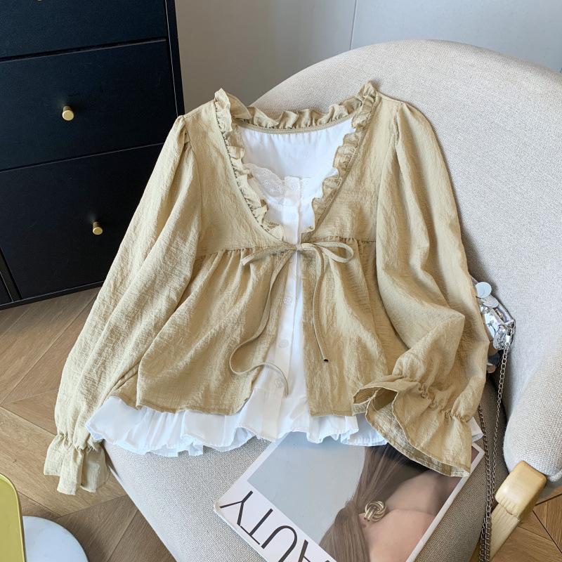 Корейская Повседневная Блузка Топ с Кружевным Воротником-рюшем для Женщин, Осенняя Женская Мода, Имитация Двойки, Кружевная Блузка с Длинным Рукавом на Шнуровке