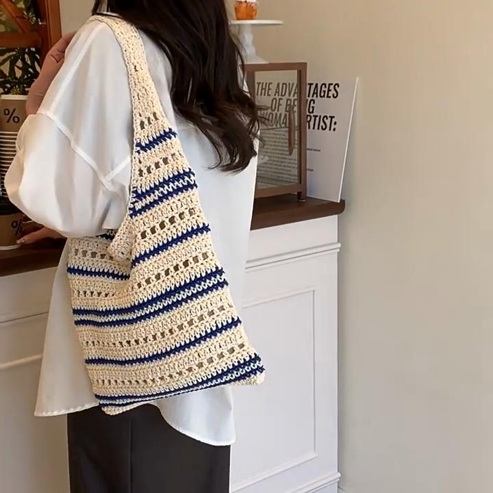 Шикарная сине-белая полосатая вязаная крючком сумка через плечо, универсальная, большой вместимости, ажурная, повседневная сумка-тоут для женщин, для летнего пляжного отдыха AVE