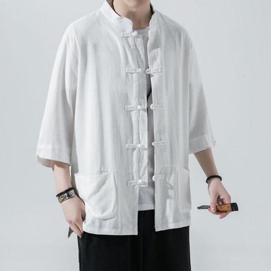 Дизайн в китайском стиле: Эта мужская рубашка с застежкой на китайские пуговицы излучает классическую и неподвластную времени привлекательность.. Рубашка имеет карманы по обеим сторонам нижней части, что обеспечивает функциональность и добавляет нотку стиля общему образу.