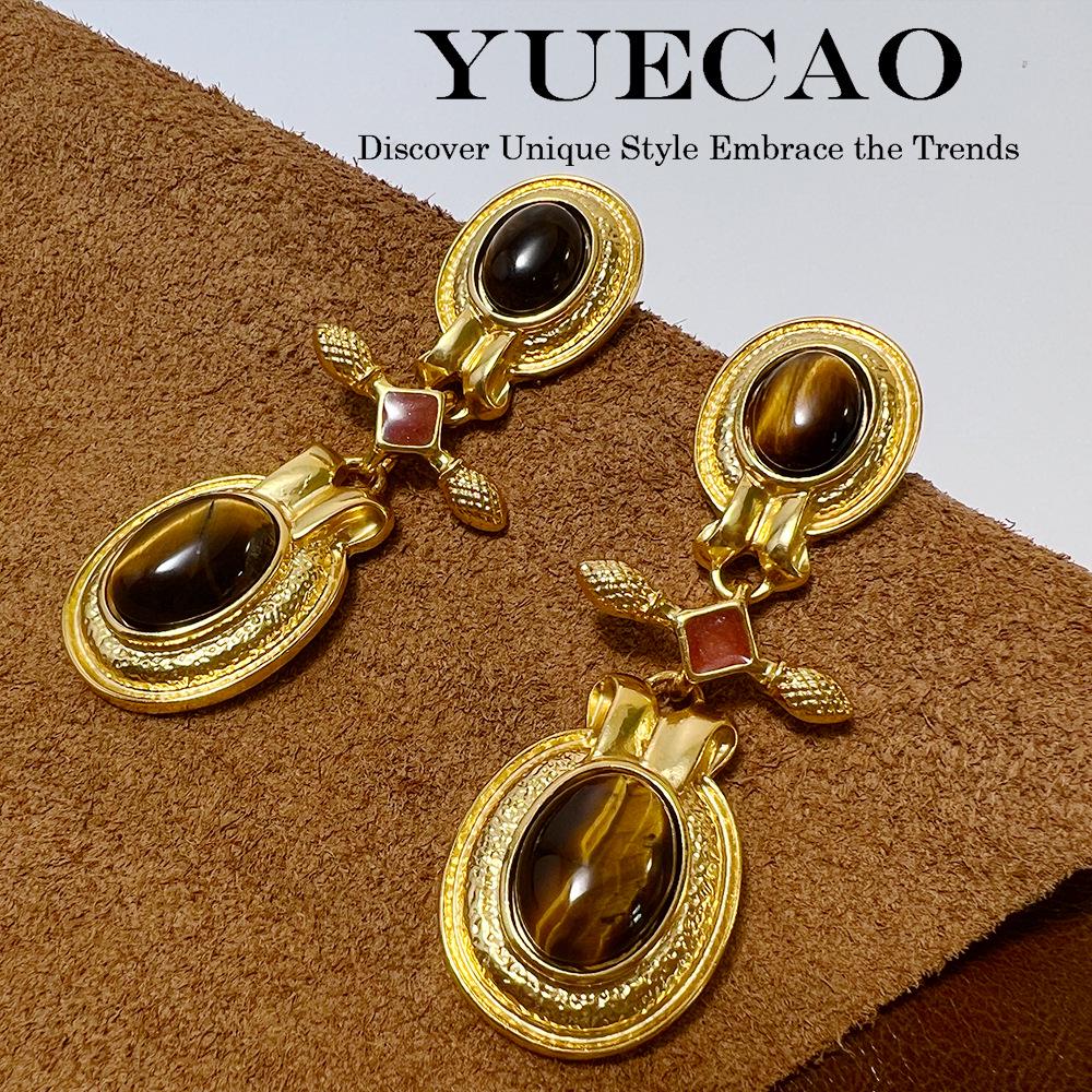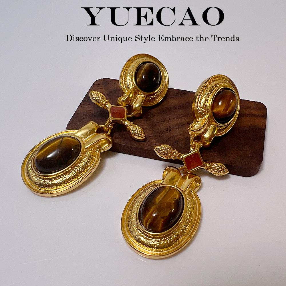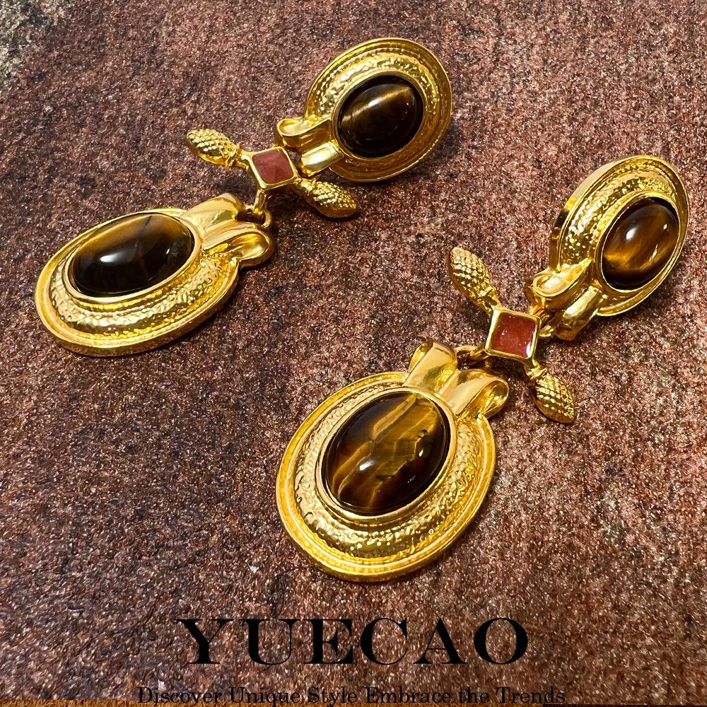 Винтажные французские антикварные серьги из золота с камнем тигровый глаз