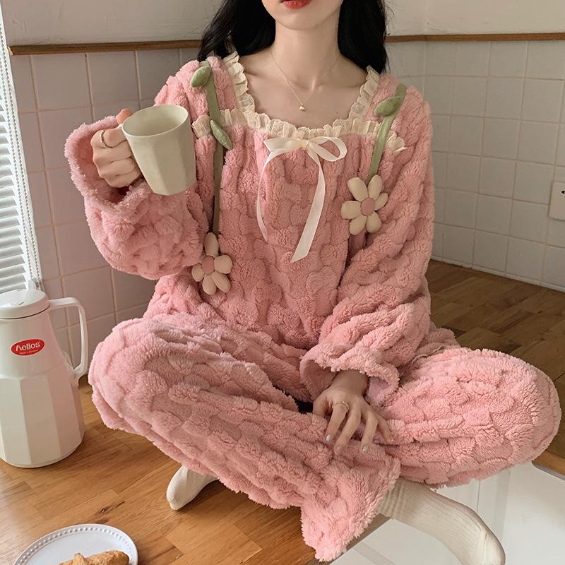Женская пижама в стиле принцессы из кораллового вельвета - Осеннее кружево, Толстый и теплый домашний костюм
