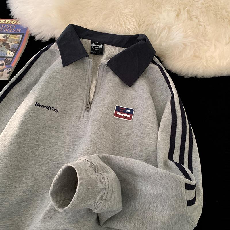Мужской японский ретро серый поло-свитшот на молнии до половины - Куртка с длинным рукавом на весну/осень