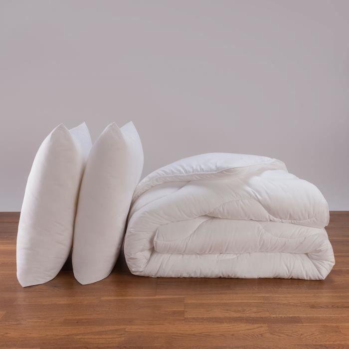 Couette - Anti-acariens - 240x260 cm - 300 g/m² - 2 oreillers inclus - Polyester blanc