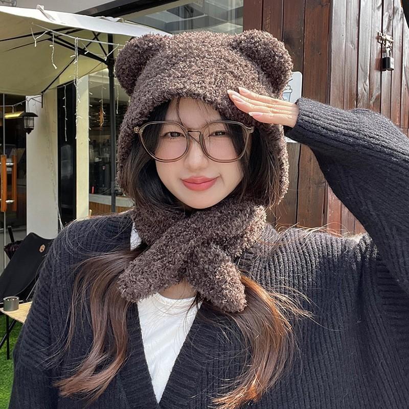 Зимний новый шарф интегрированный двухкомпонентный набор плюшевая шапка с мишкой холодостойкая вязаная женская теплая защита ушей головной убор