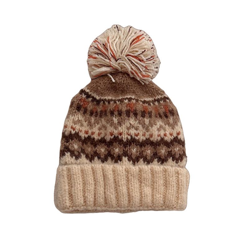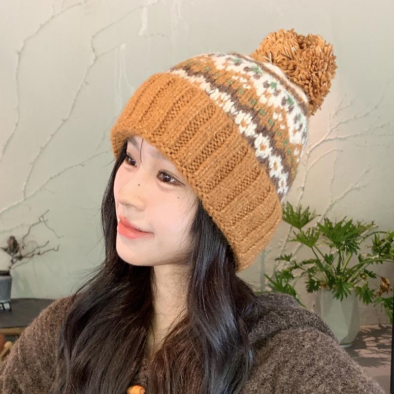 Зимняя новая жаккардовая контрастная шерстяная шапка женская утолщенная теплая ветрозащитная шапка шапка-пуловер милая шапка с помпоном вязаная шапка