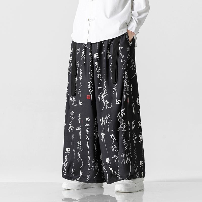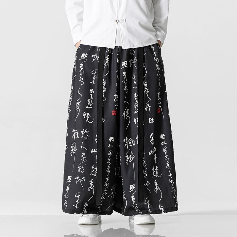 2024 Новые повседневные широкие брюки в китайском стиле с винтажным принтом, мужские шаровары в стиле кунг-фу, мужские мешковатые юбки-брюки ханьфу
