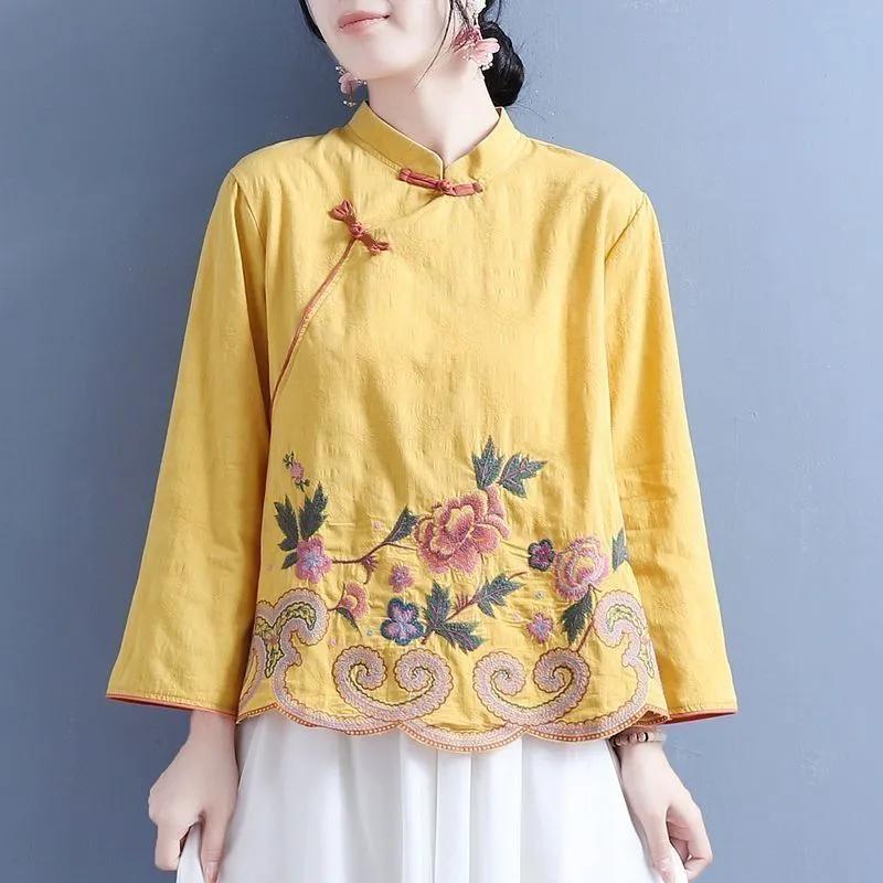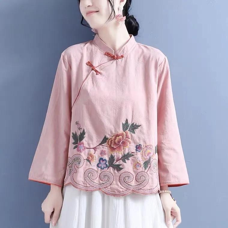 Весенние Ретро Вышитые Хлопково-Льняные Рубашки в Китайском Стиле на Пуговицах с Длинным Рукавом и Воротником-стойкой Свободные Топы