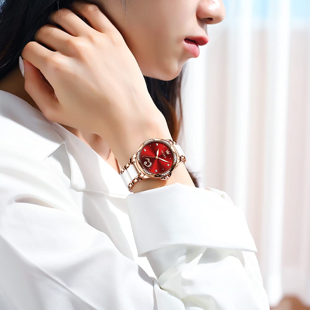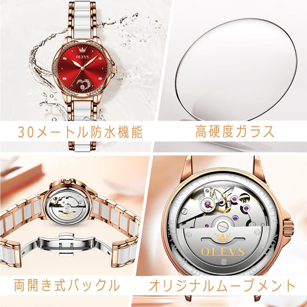 OLEVS wristwatch for women, mechanical, automatic, cute, ladies' watch, ceramic, pink gold, date, crystal, red, ladies watch