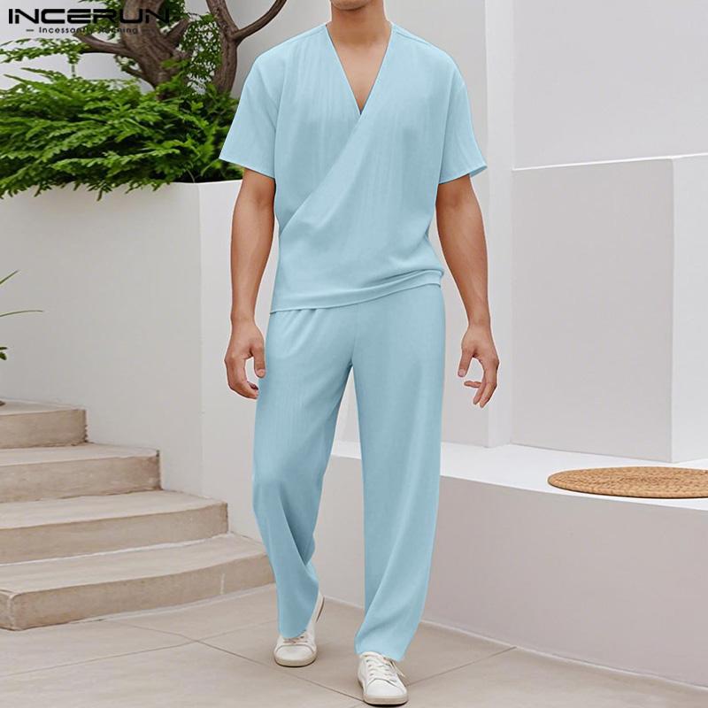 INCERUN Комплекты из двух предметов для мужчин: текстурная футболка с коротким рукавом и V-образным вырезом, длинные прямые брюки — купить товар онлайн с бесплатной доставкой по всему миру!