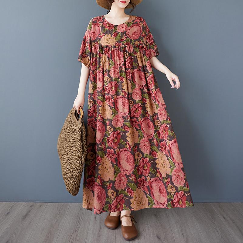 DIMANAF 2025 Летнее Женское Винтажное Длинное Платье Большого Размера с Коротким Рукавом, Повседневное Базовое Свободное Платье с Цветочным Принтом