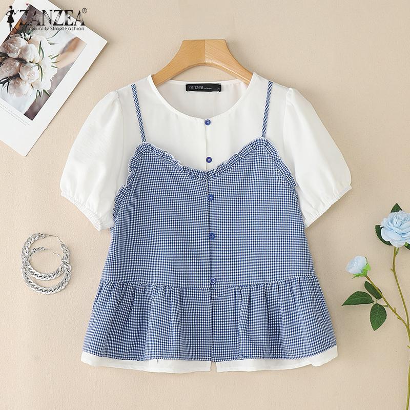 ZANZEA Женская летняя блузка с круглым вырезом, клетчатым принтом, в стиле пэчворк, с коротким рукавом