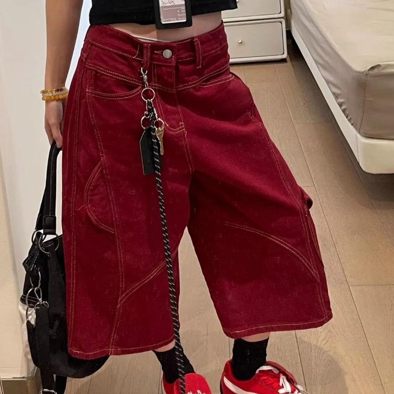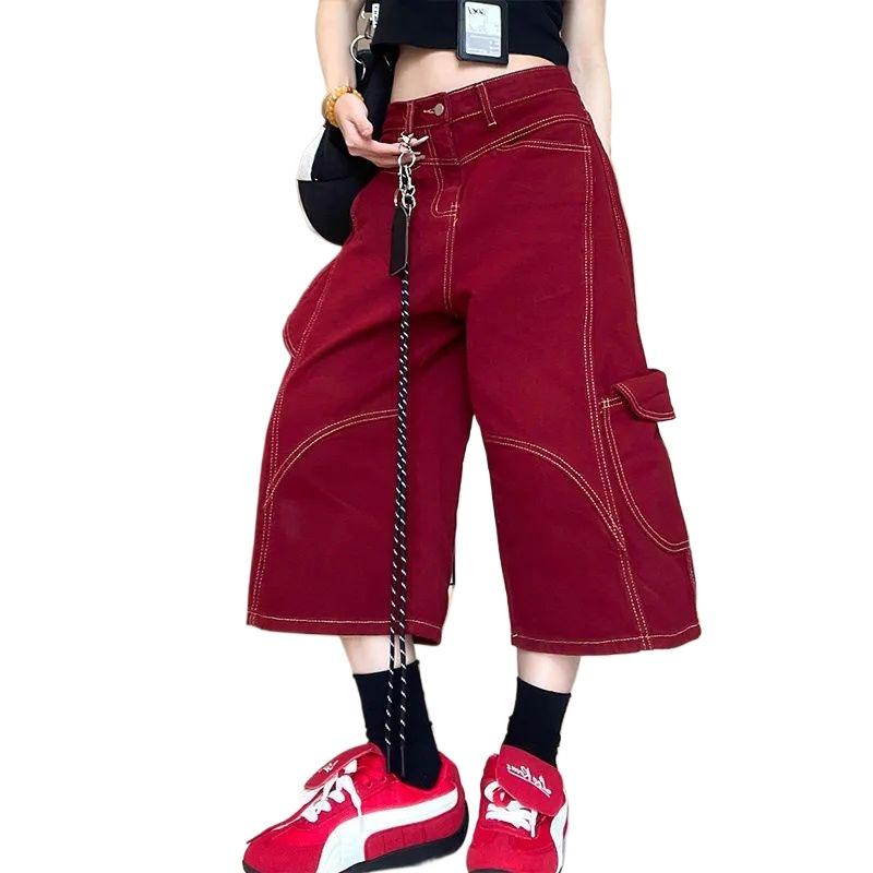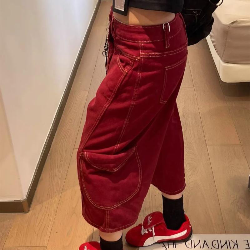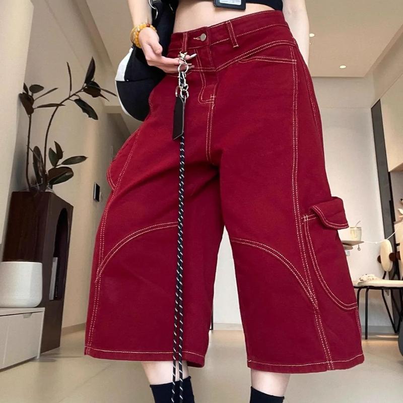 Красные женские укороченные брюки с несколькими карманами, американские ретро, свободные, женские брюки карго, с высокой талией, универсальная летняя одежда