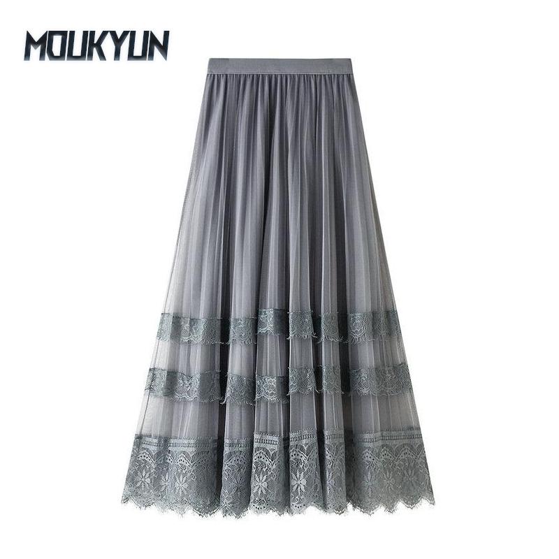 Корейская версия юбки-сетки с кружевной вставкой на высокой талии, женская плиссированная юбка А-силуэта средней длины — купить товар онлайн с бесплатной доставкой до всему миру!