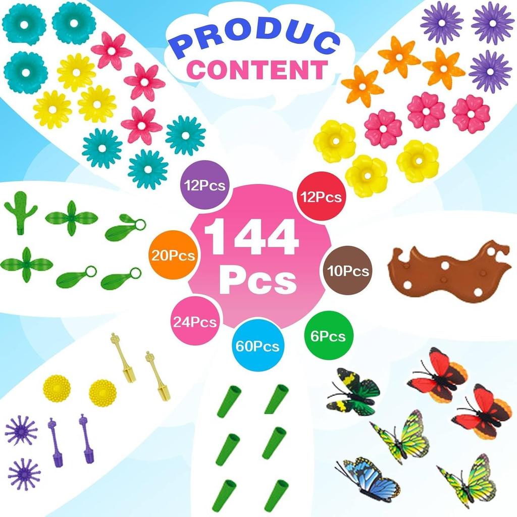 🌺【Забавный конструктор цветов】Это отличный художественный набор для детей, чтобы создавать великолепные букеты и красивые цветники, используя в общей сложности 144 красочные детали! Вы можете свободно формировать стебли цветов, используя изогнутые стебли и разветвленные части стеблей.. Наслаждайтесь созданием собственных цветочных композиций с бесконечными сочетаниями красивых бабочек и красочных цветов и стеблей.