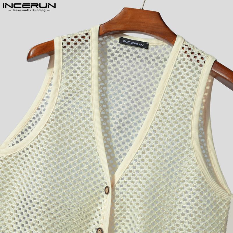 INCERUN Мужские майки без рукавов с V-образным вырезом на пуговицах, ажурные, пляжные