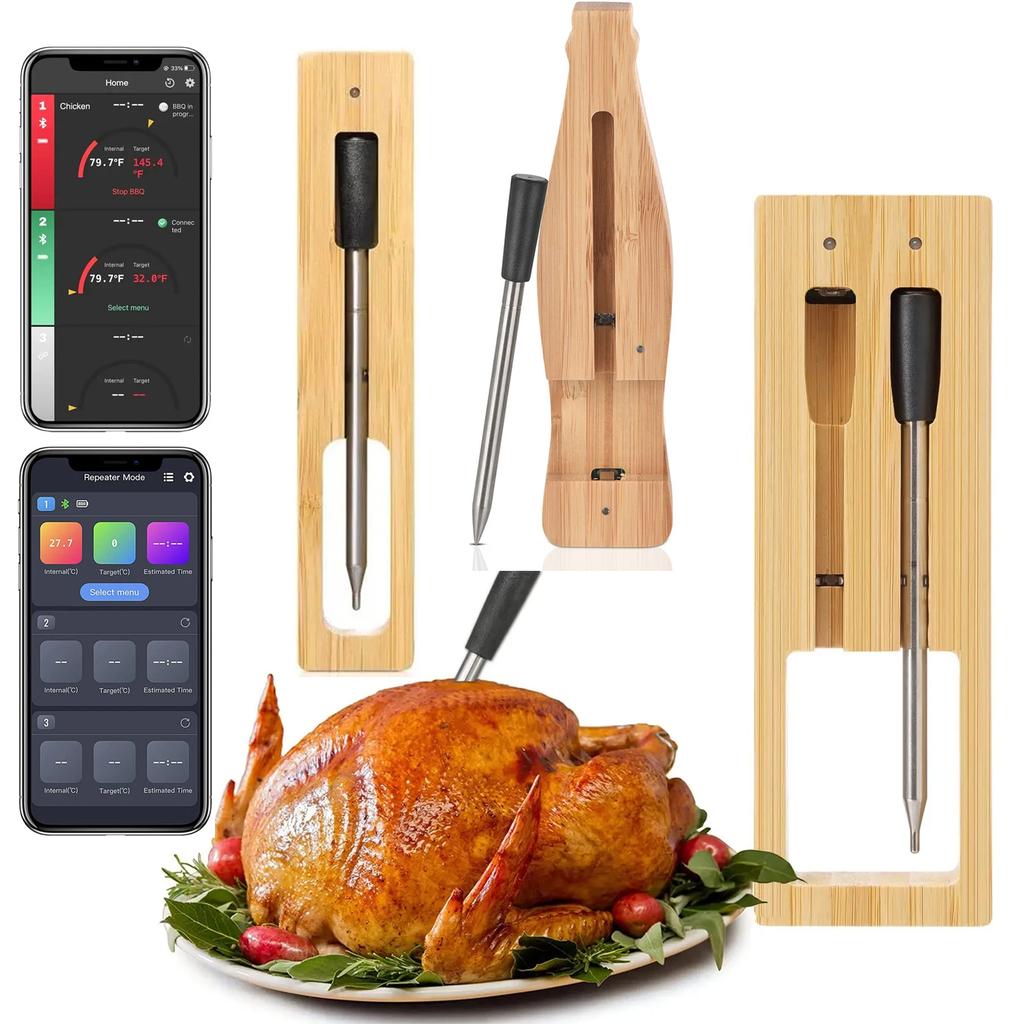 【Готов к использованию и длительная работа】Умный беспроводной термометр для мяса имеет преимущество в том, что вы можете использовать щуп 48 часов каждый раз после его извлечения, и без необходимости заряжать его перед каждым использованием, пока не разрядится бамбуковая базовая станция-репитер. (90 дней). После того, как ретранслятор разрядится, его нужно зарядить всего 2 часа, и зонд снова будет заряжаться автоматически в течение 90 дней.. Долгая работа термометра для воды для гриля и копчения.