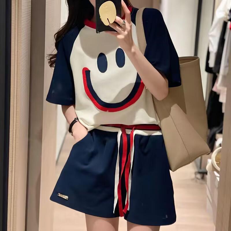 Женские спортивные костюмы больших размеров с вышивкой в виде смайлика - Летний свободный повседневный комплект из двух предметов с шортами и короткими рукавами, в трендовом стиле