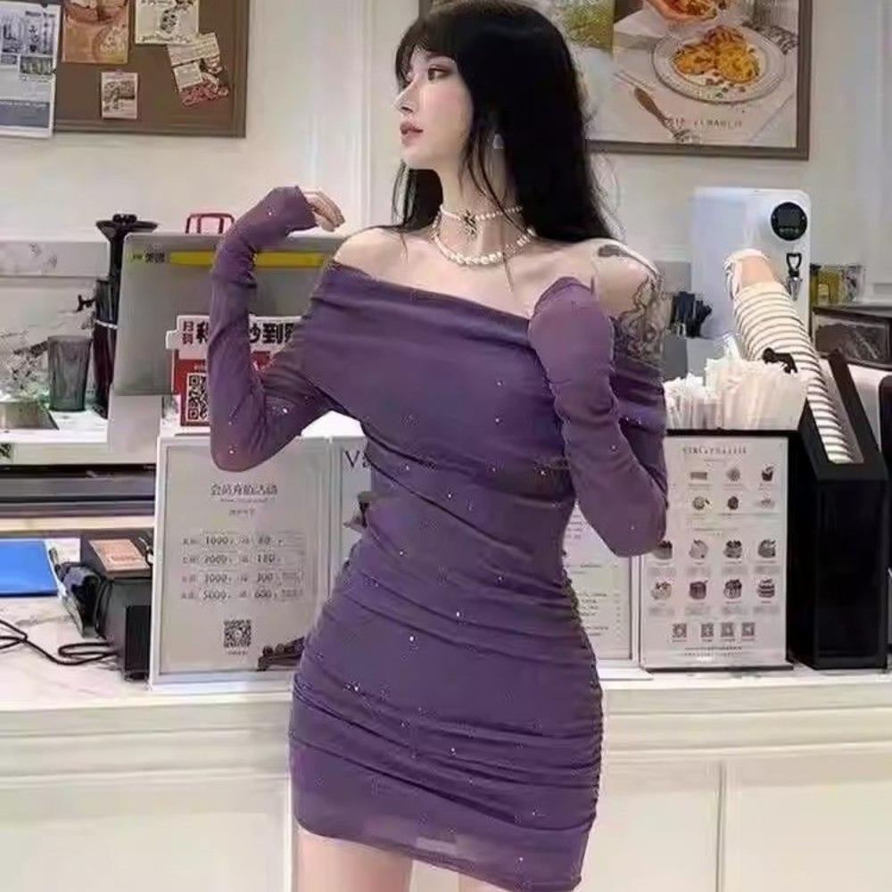 Фиолетовое Сверкающее Платье Нового Темперамента Стиля Чистая Страсть с Открытым Плечом на Одну Лямку, Длинными Рукавами, Приталенное по Талии, Юбка по Бедрам для Женщин