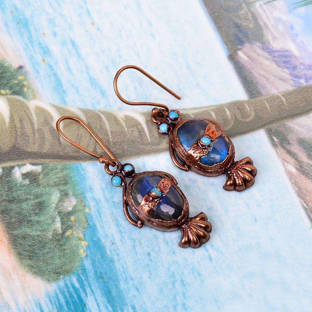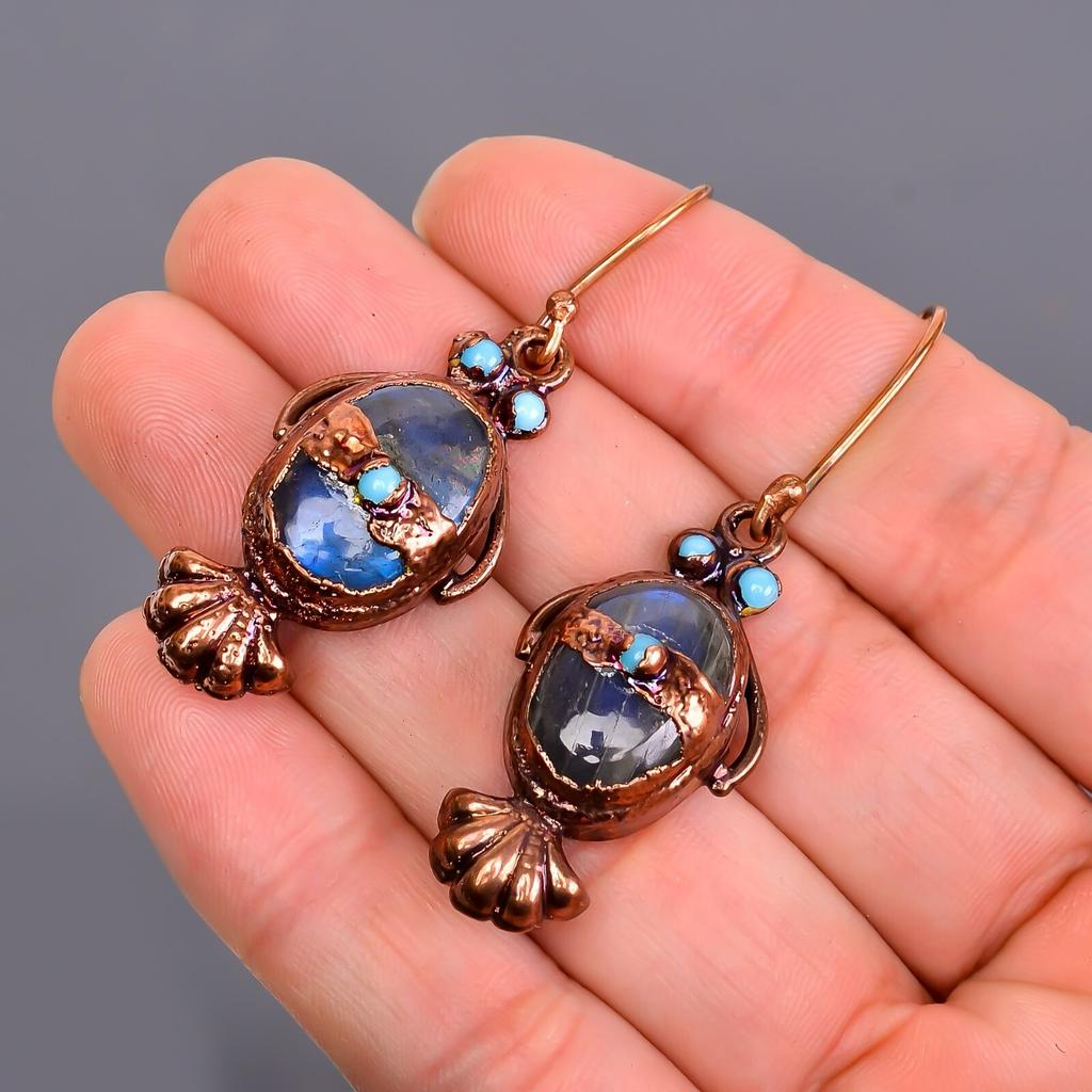 Лабрадорит Камень Артизанские Подвесные Серьги-капли Электроформованные Крючки Ювелирные изделия Медь V-112