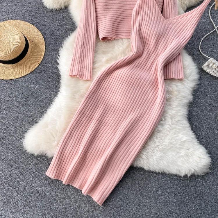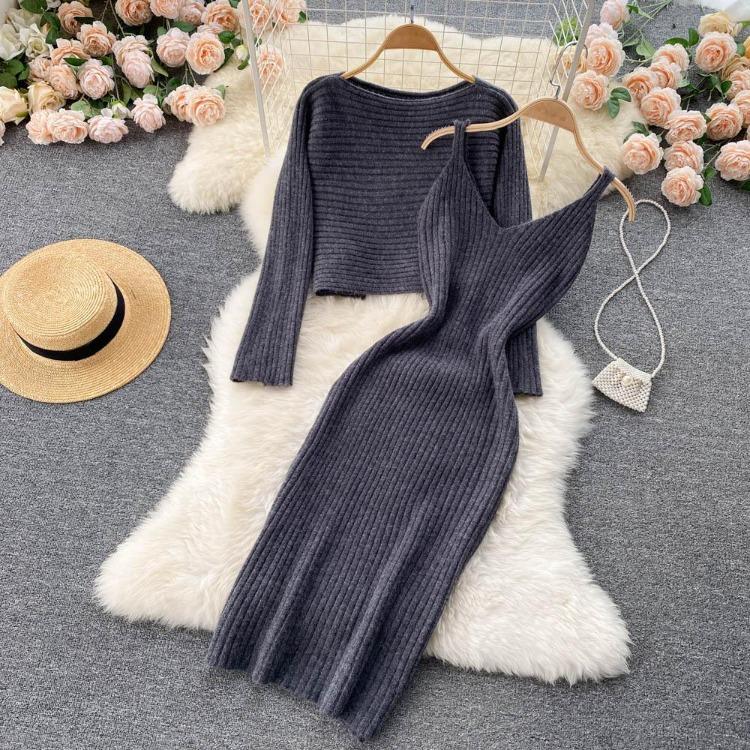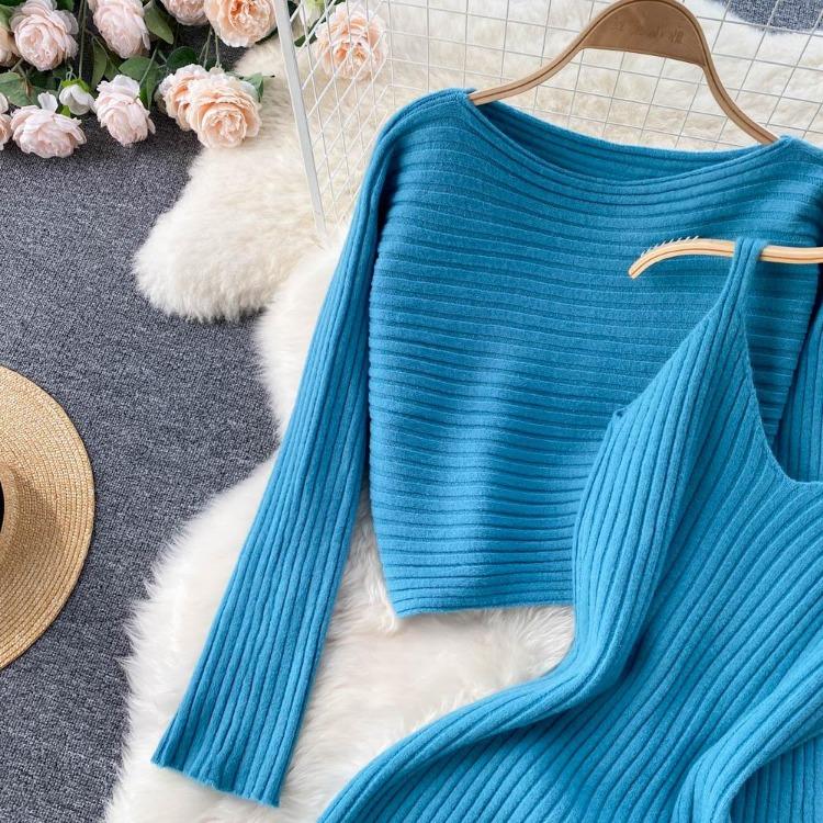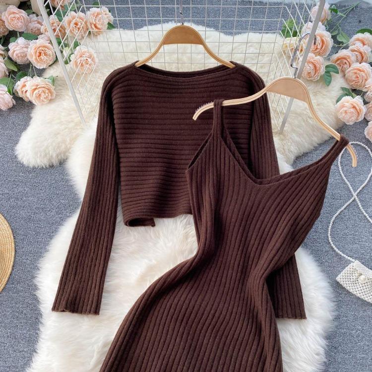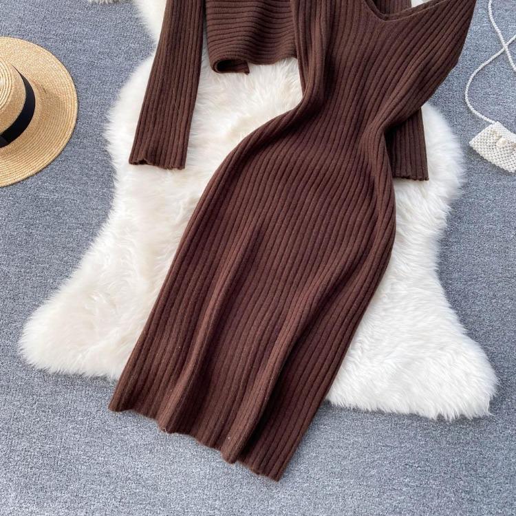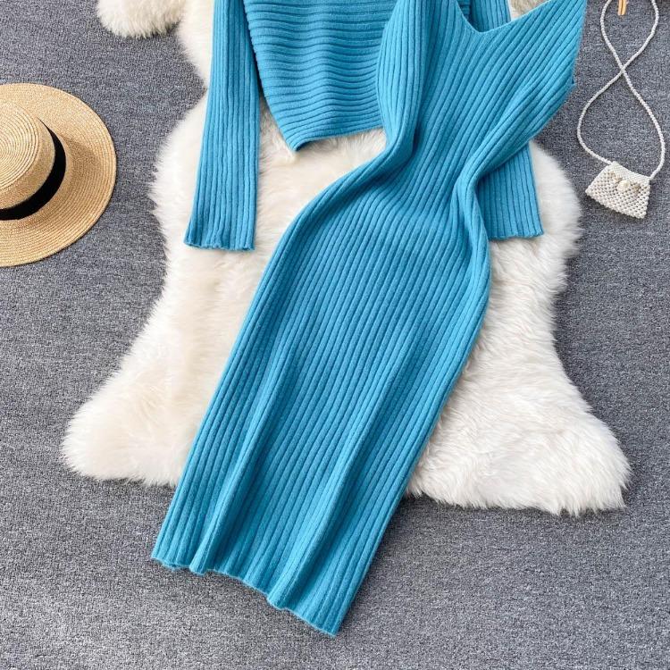 Женский осенне-зимний вязаный комплект, облегающий однотонный костюм-двойка, универсальный кроп-свитер, платье-хипстер для леди