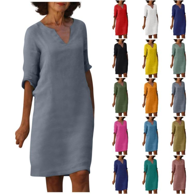 Женское летнее однотонное хлопково-льняное платье в стиле ретро с v-образным вырезом и короткими рукавами, легкое дышащее платье