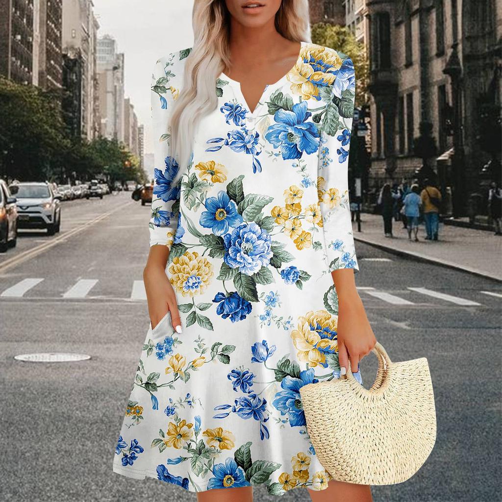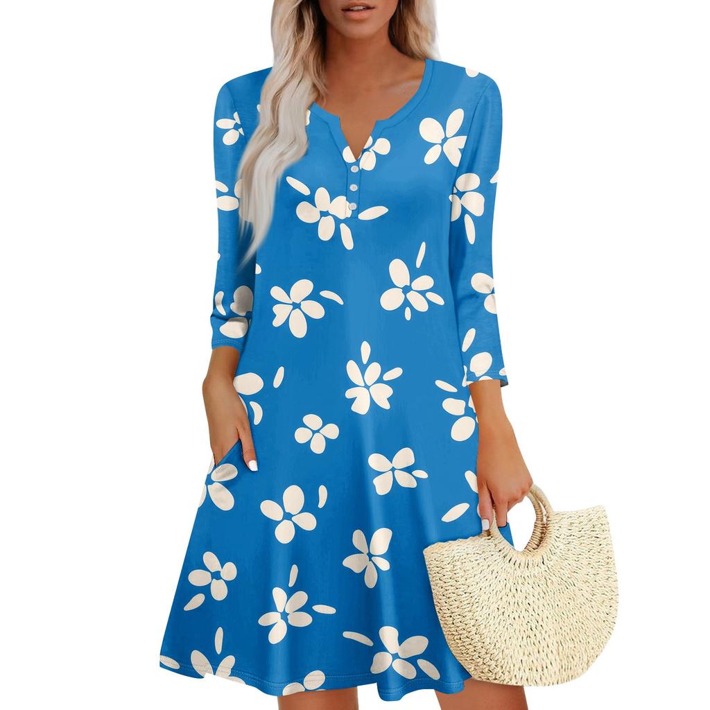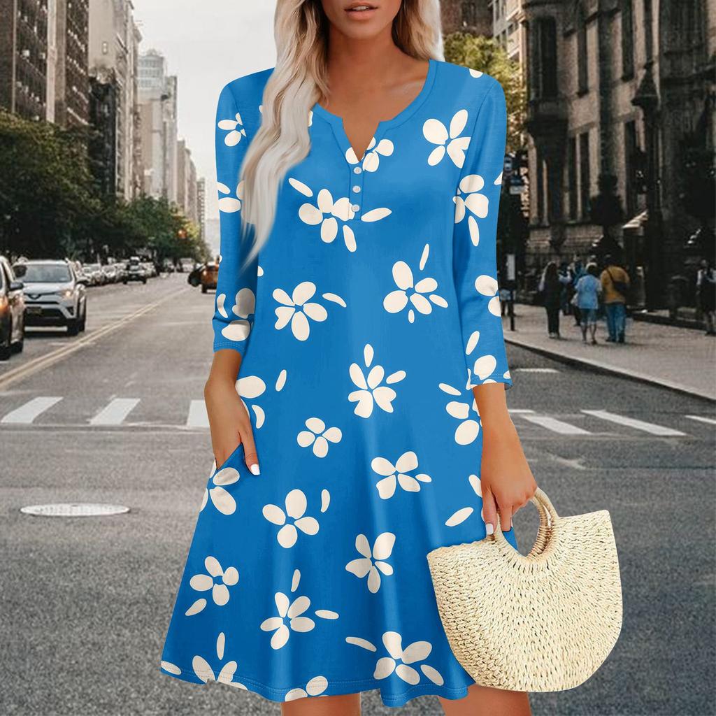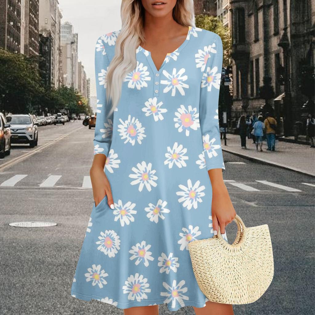 Женское летнее платье, свободное платье с V-образным вырезом, рукавом три четверти и карманами