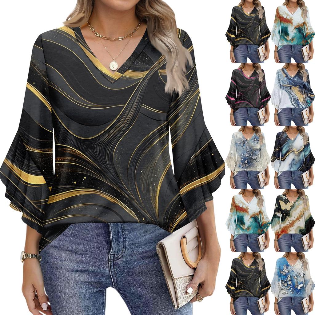 Блузки для женщин нарядные повседневные рукав 3/4 женские топы футболки с V-образным вырезом рубашки с расклешенным рукавом
