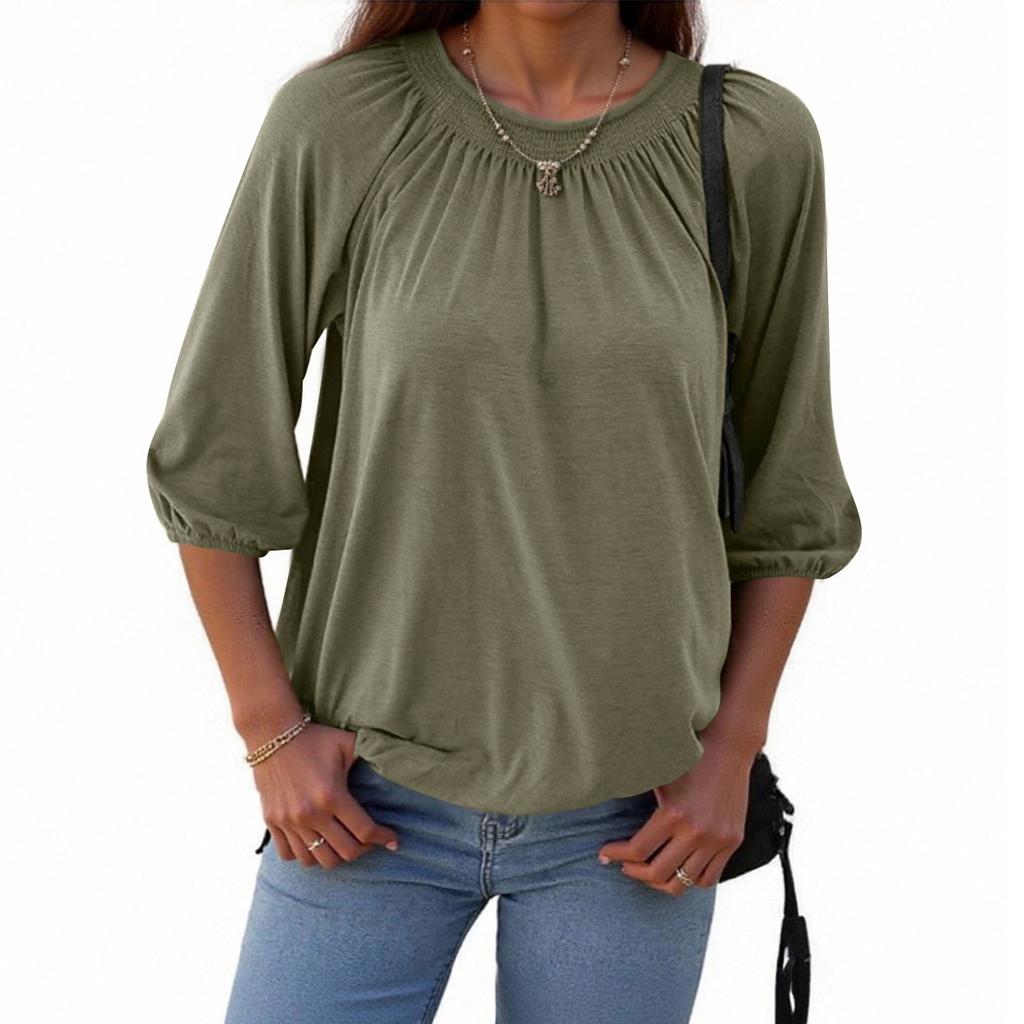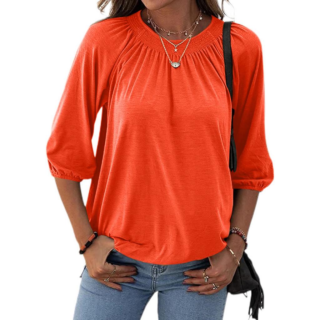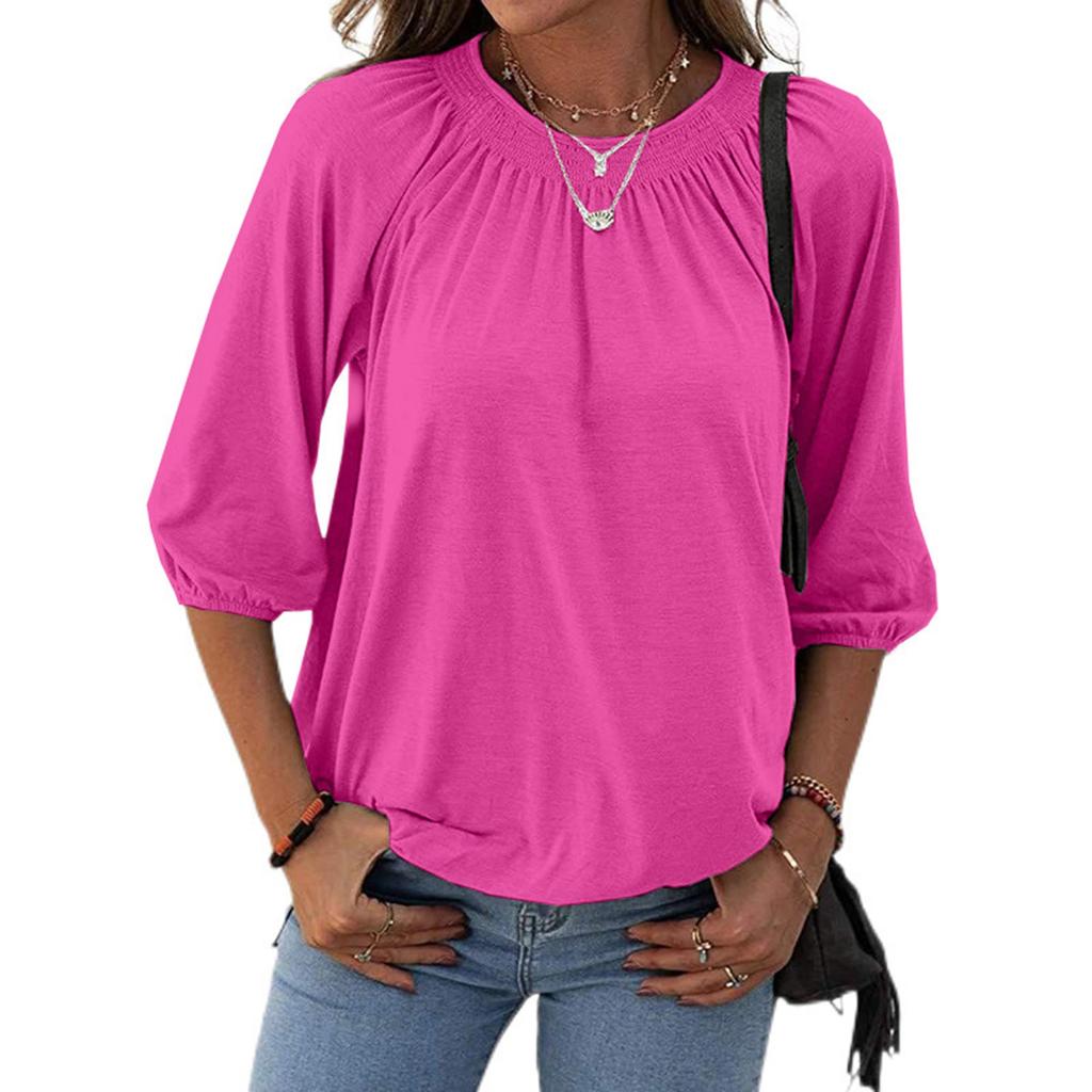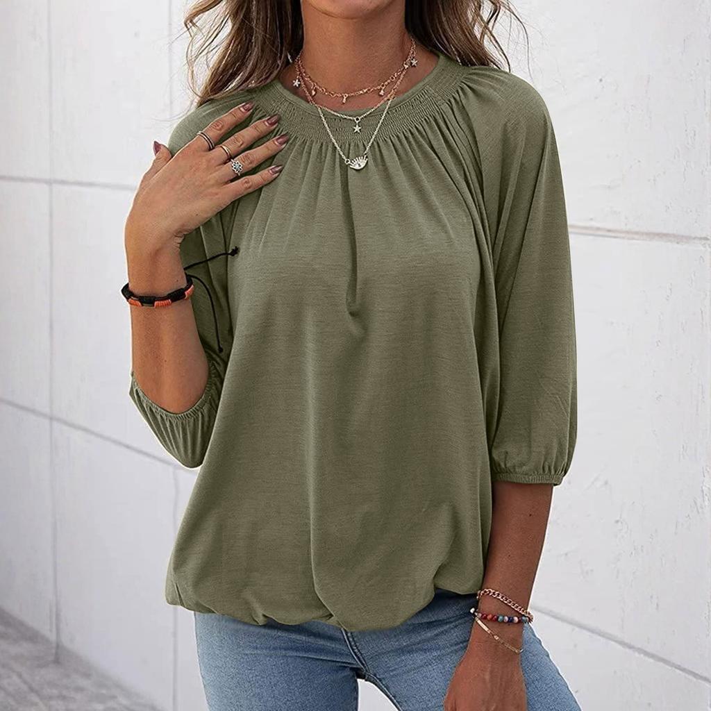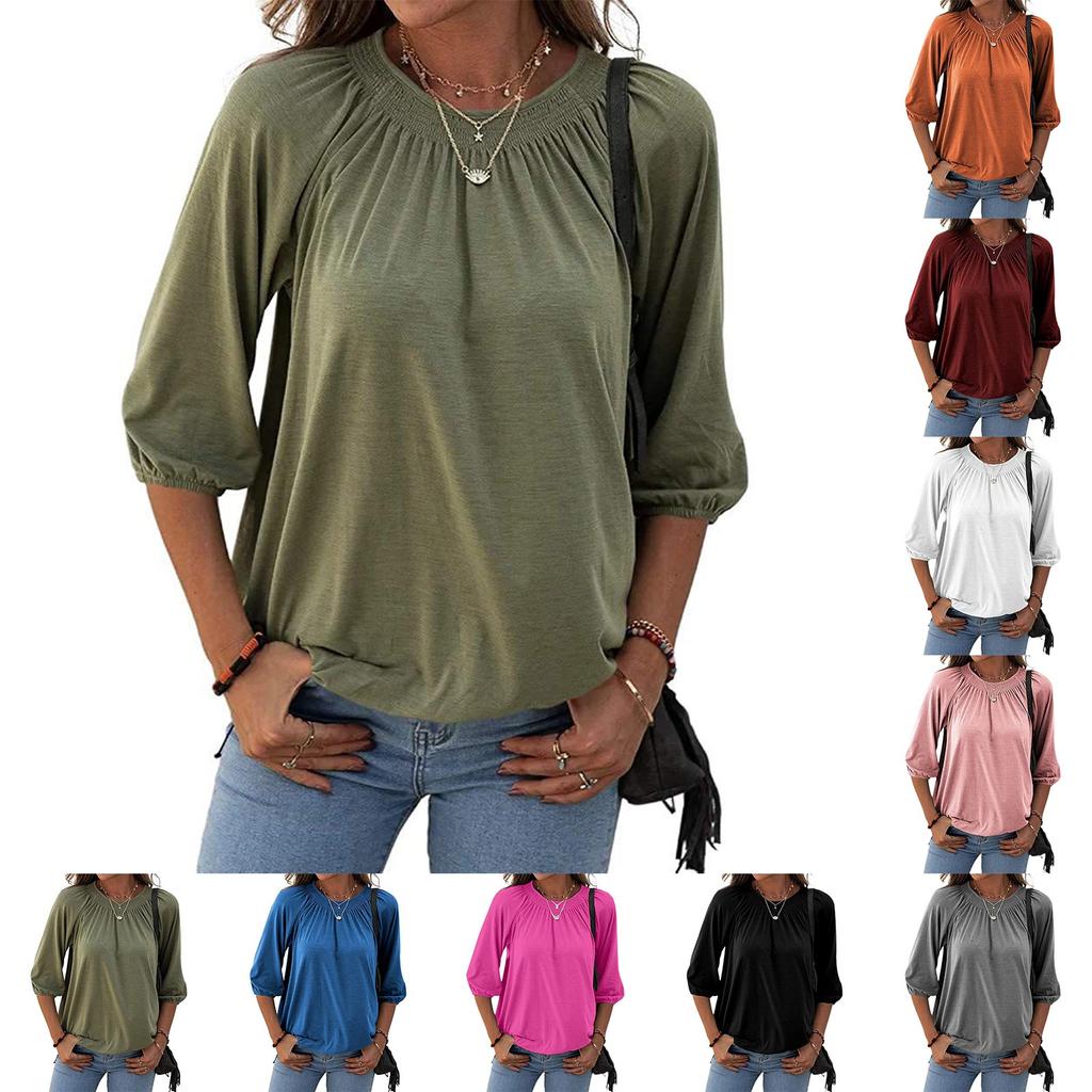 Женская однотонная футболка с круглым вырезом, рубашка с рукавом до локтя / рукавом 3/4, повседневная, свободная, плиссированная, базовая