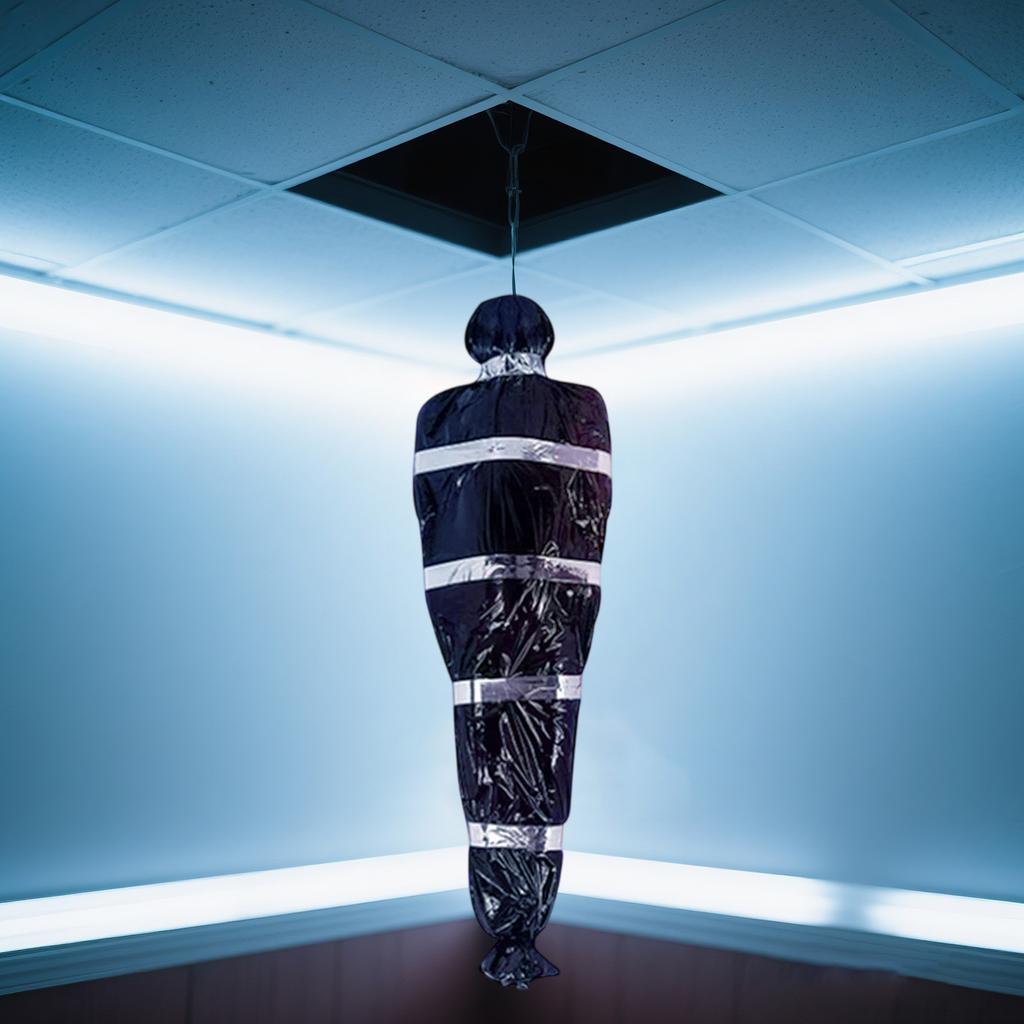 Надувной Подвесной Труп: Просто надуйте реквизит мертвого пострадавшего, поместите его внутрь и обмотайте лентой.. Этот надувной реквизит легко установить и можно повесить в разных местах, что делает его привлекательной изюминкой для хэллоуинских экспозиций в помещении и на улице.