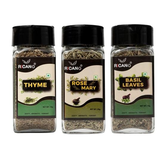 Рикано Тимьян 15г, Розмарин 25г, Листья базилика 15г Комбо (Пакет из 3) | Сушеные травы | Натуральная приправа | Упаковка в стеклянной бутылке | Запечатано для свежести