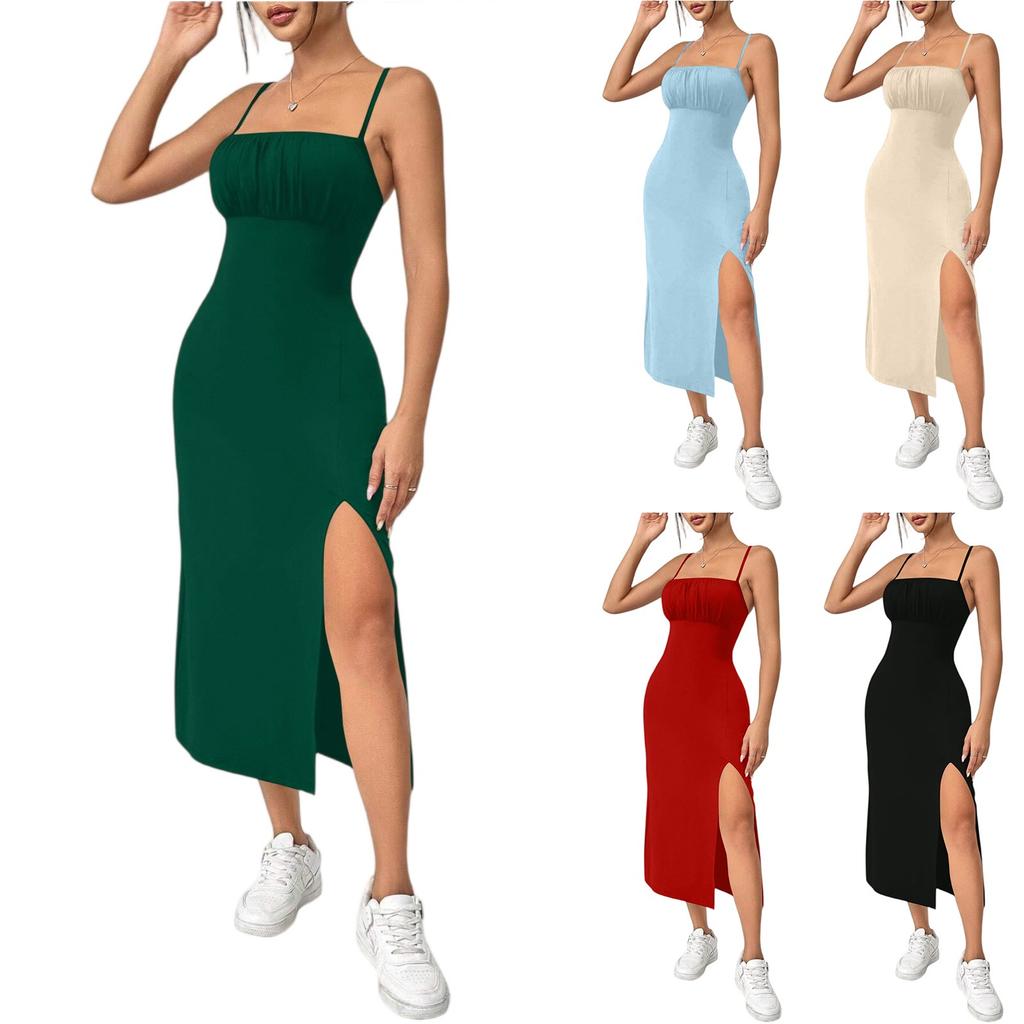 Женское летнее регулируемое платье-миди без рукавов на тонких бретельках с высокой талией и разрезом — купить товар онлайн с бесплатной доставкой по всему миру!