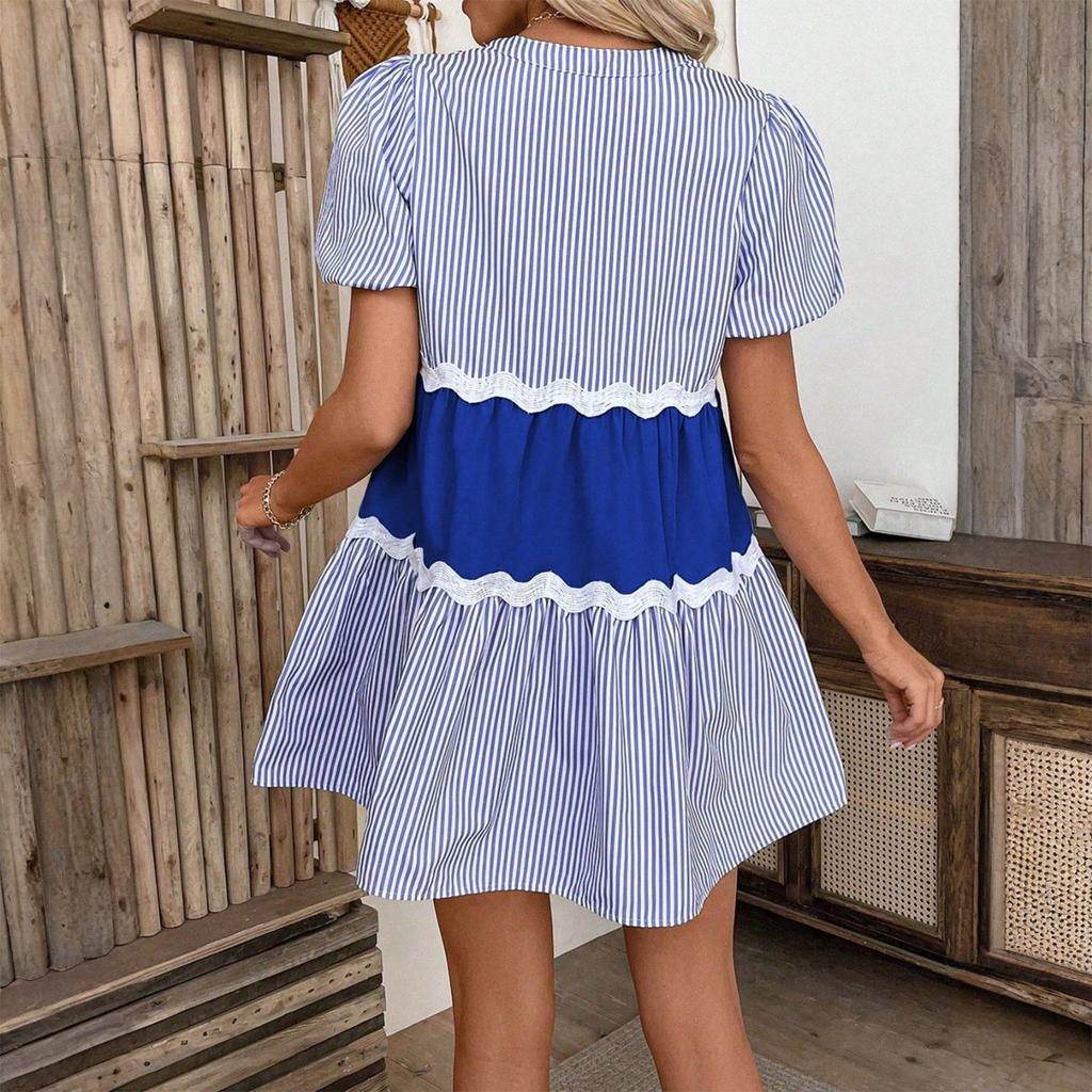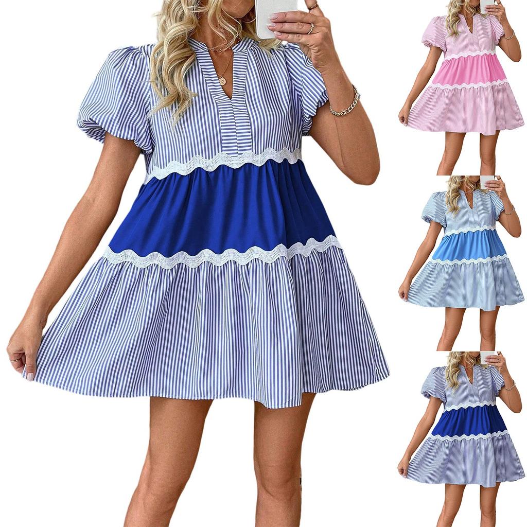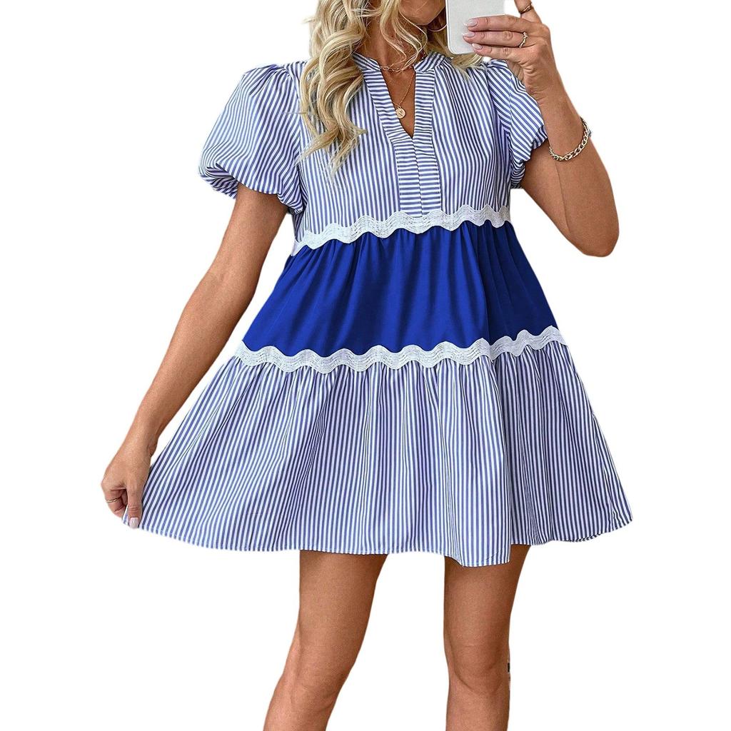 Летнее женское платье А-силуэта с кружевной полосатой вставкой, свободное и прохладное платье с воротником-стойкой