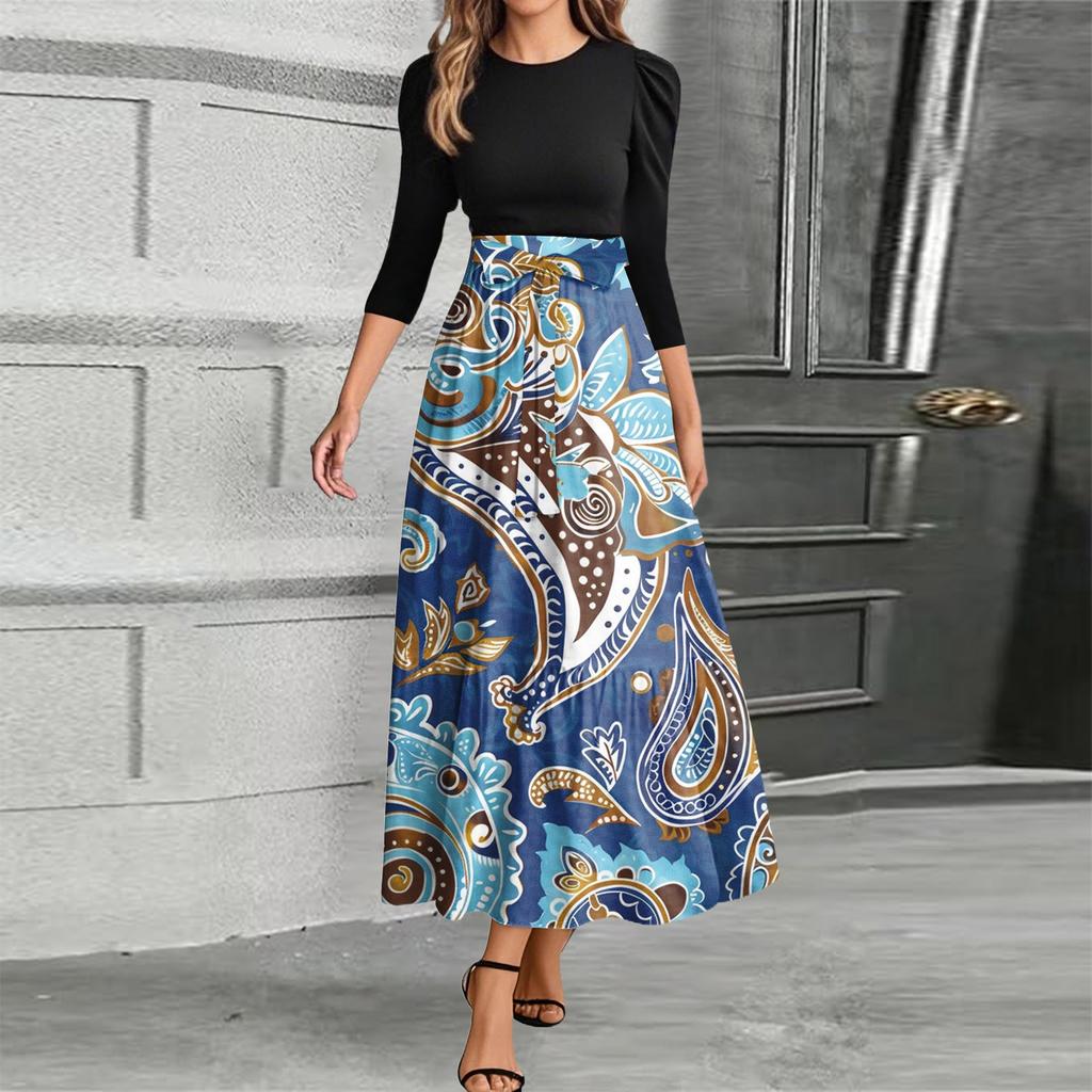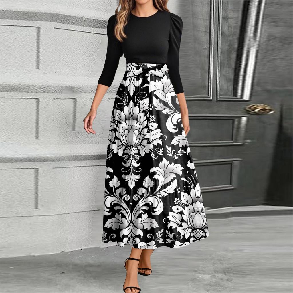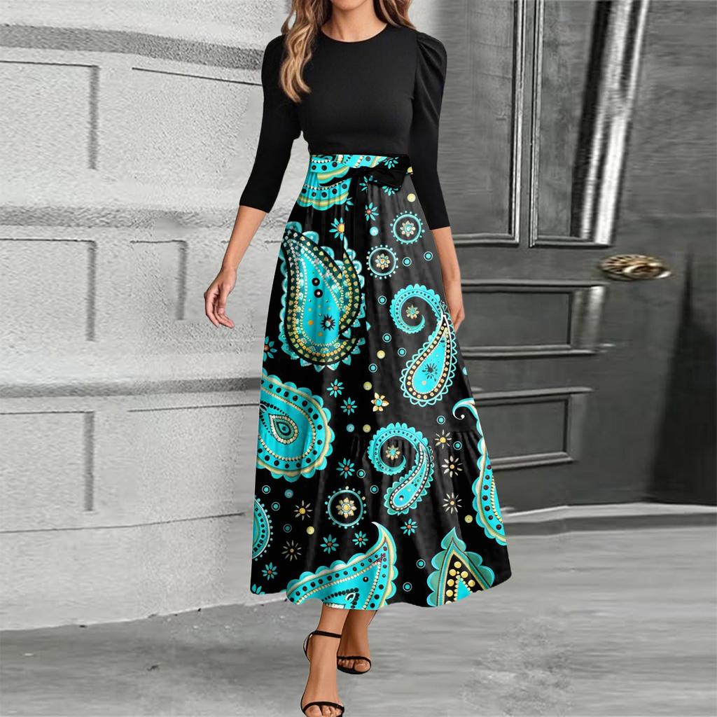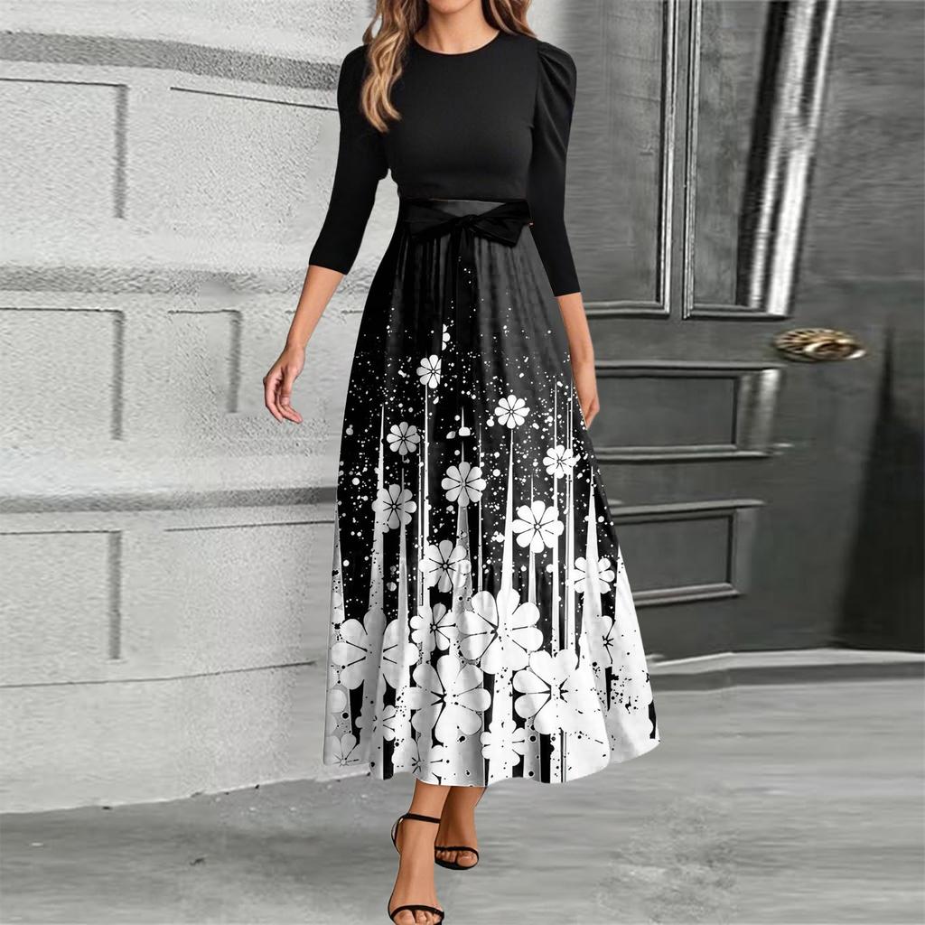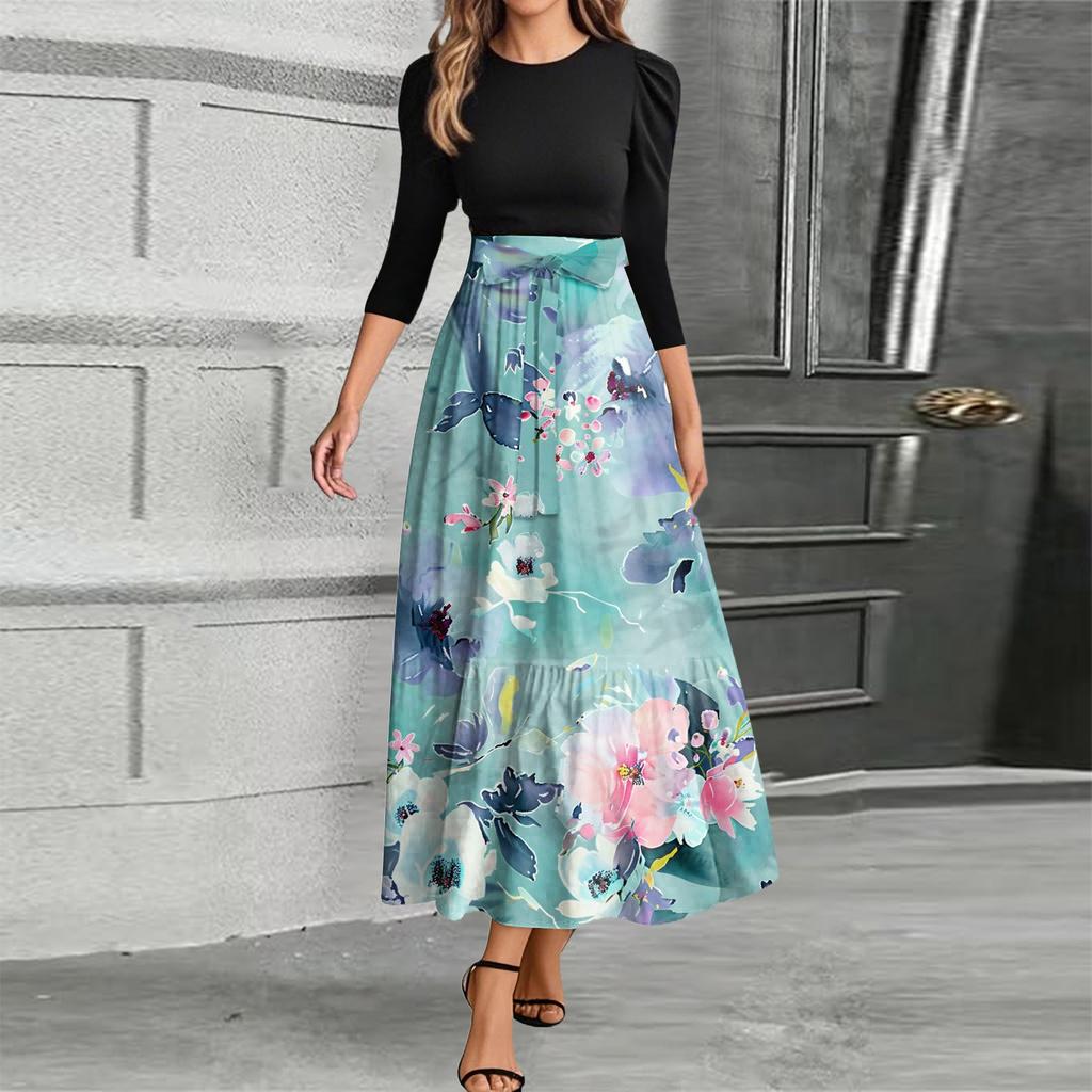 omen Fashion casual галстук рукав три четверти круглый вырез цветочный пэчворк элегантный темперамент платье
