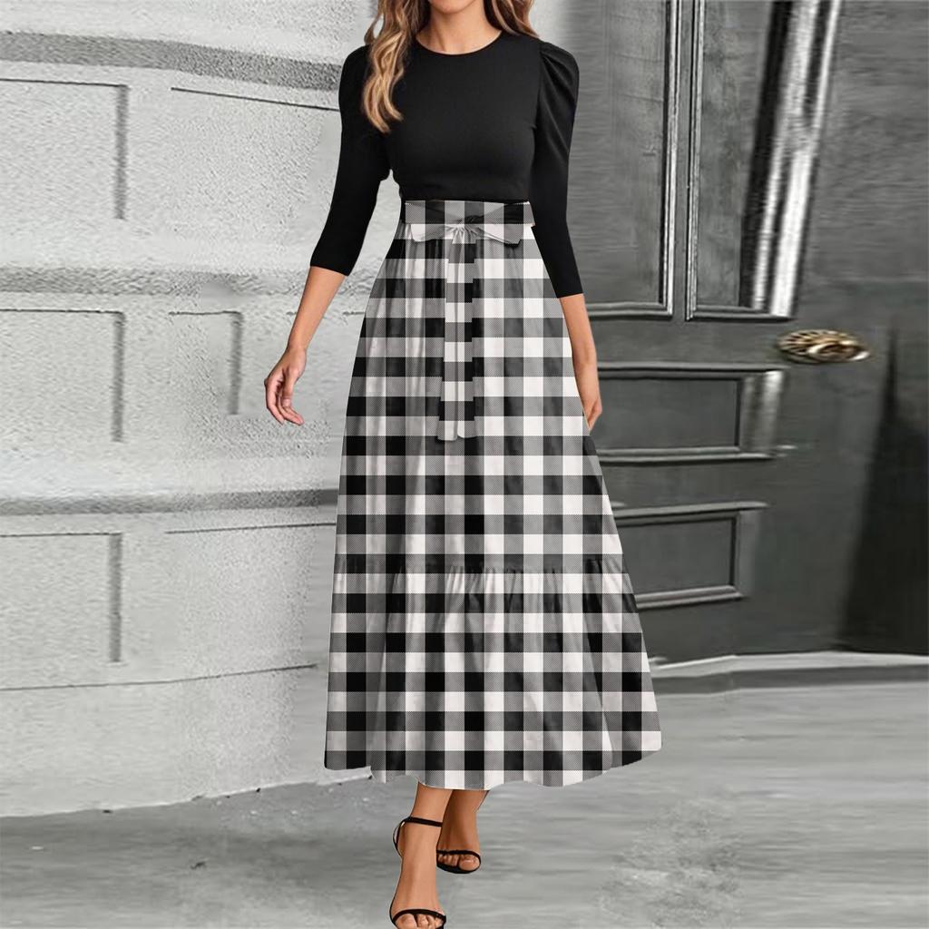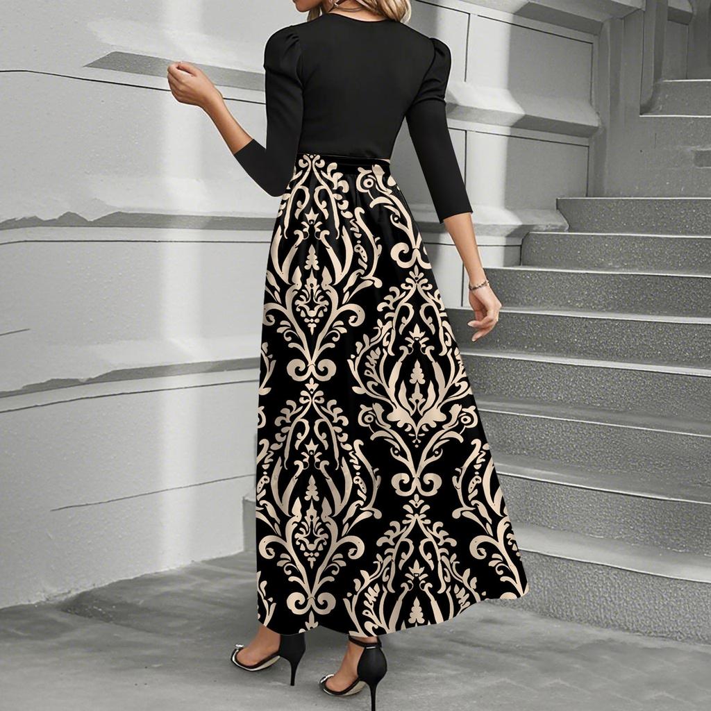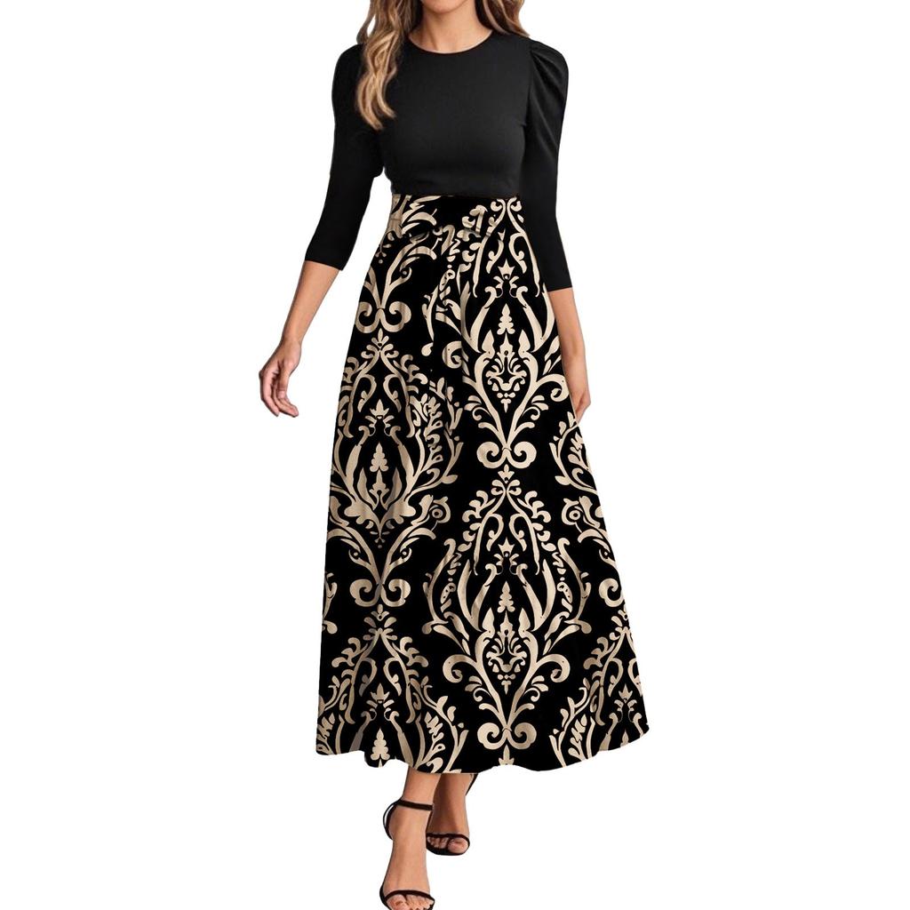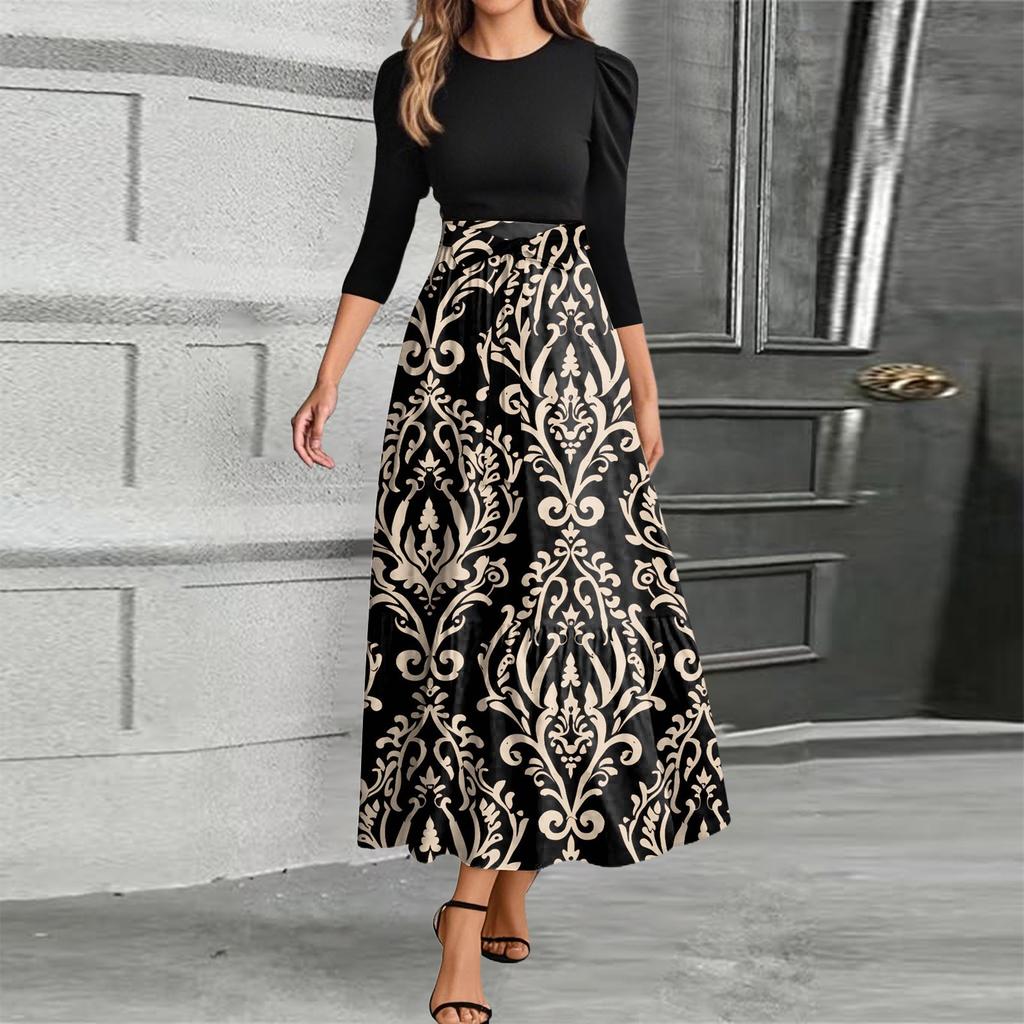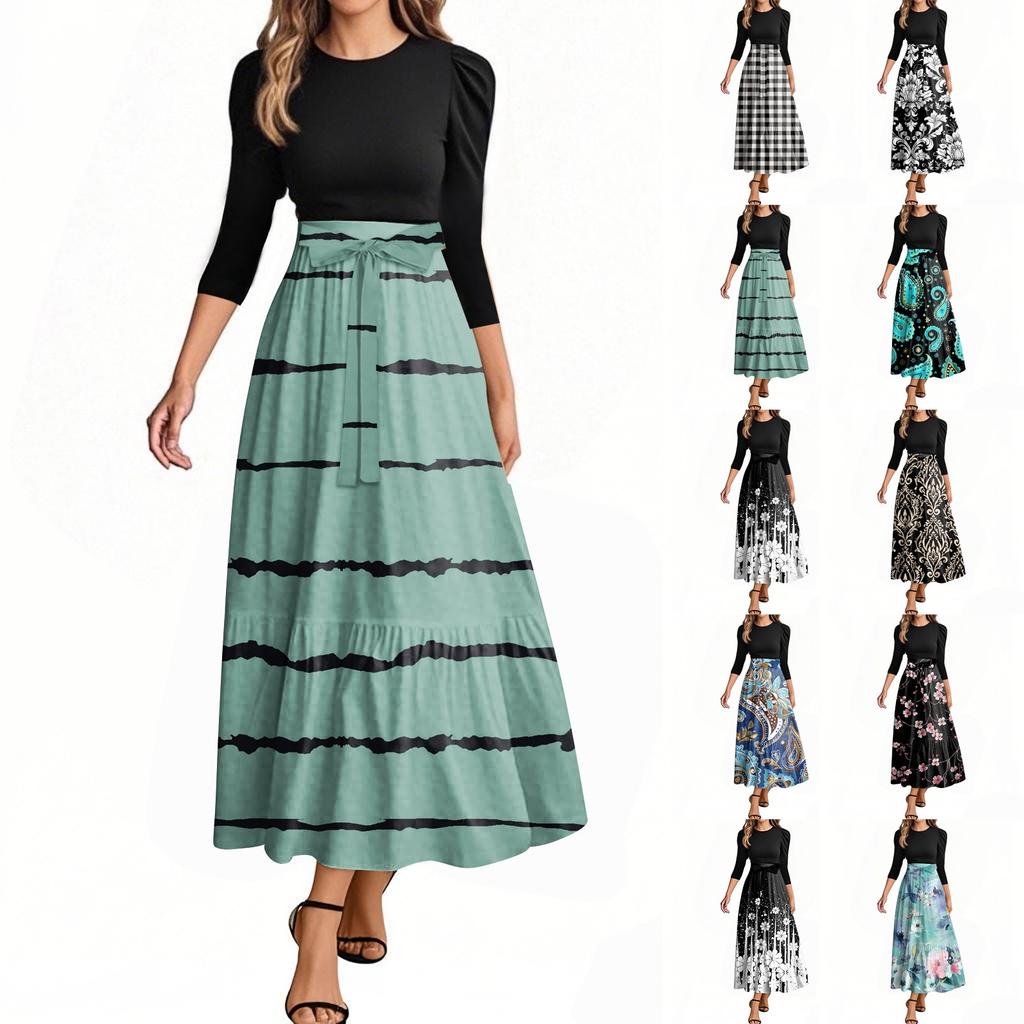 omen Fashion casual галстук рукав три четверти круглый вырез цветочный пэчворк элегантный темперамент платье