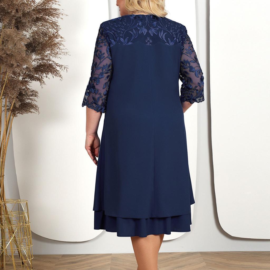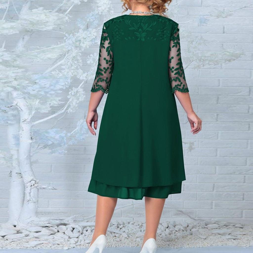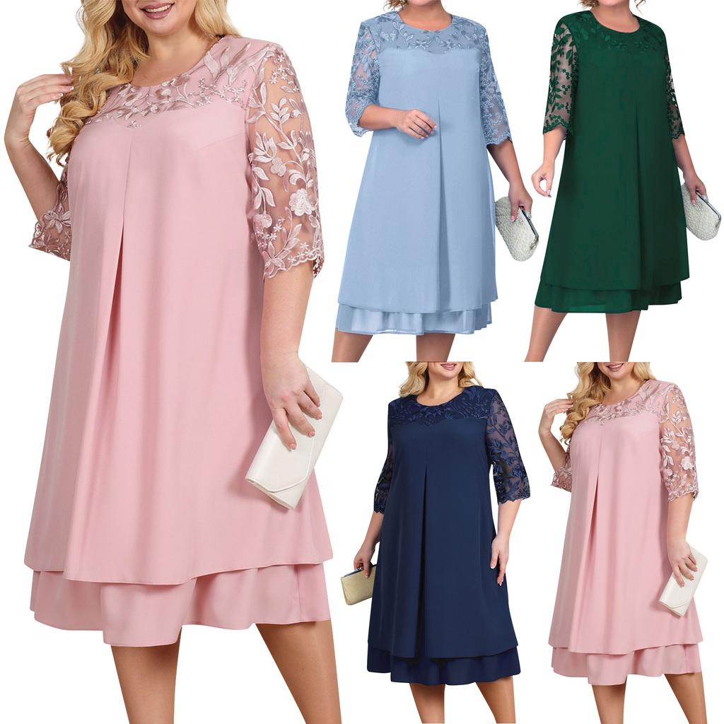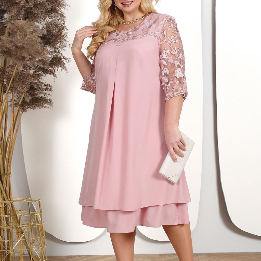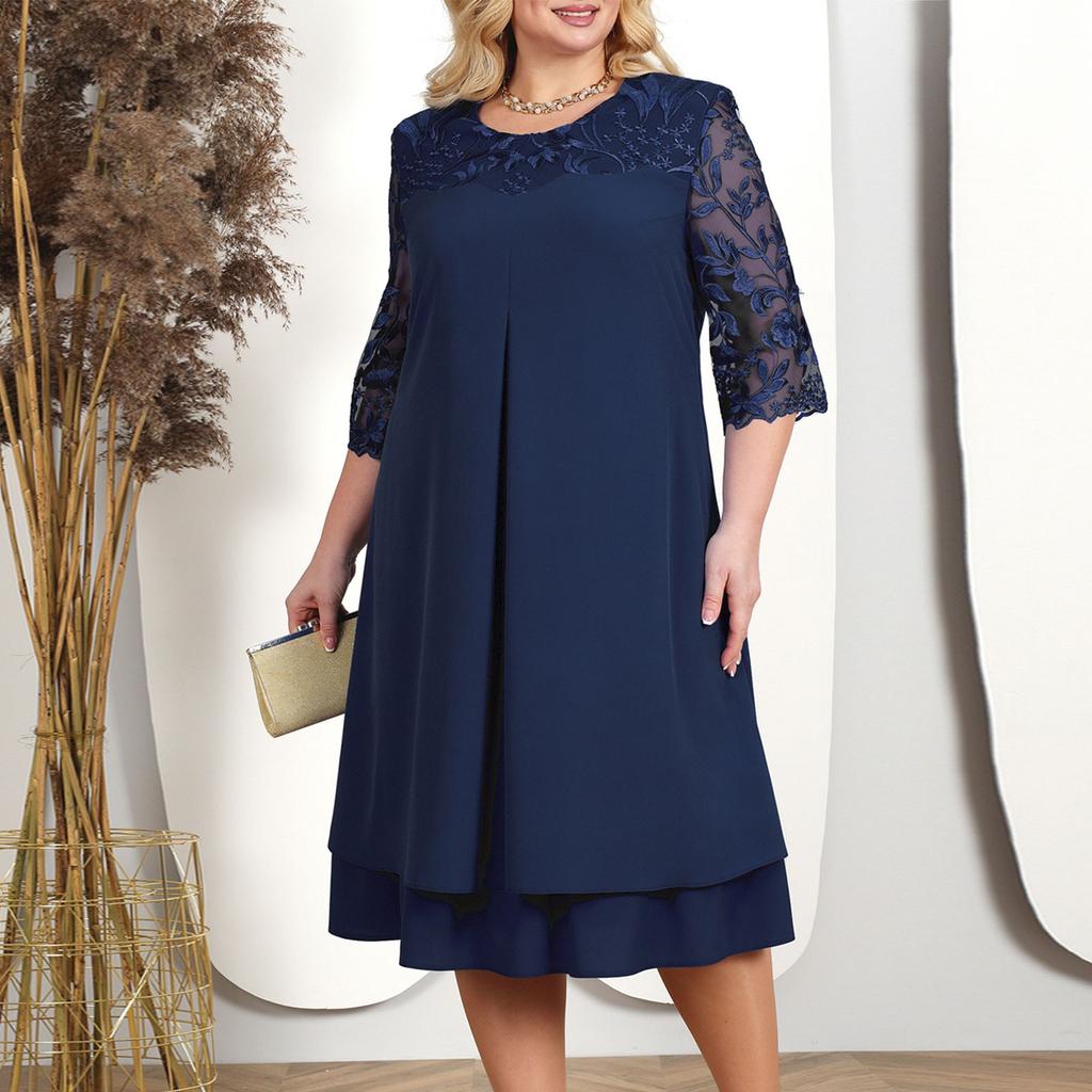 Женское сплошное цветное лоскутное кружевное повседневное платье с половиной рукавом и круглым вырезом большого размера