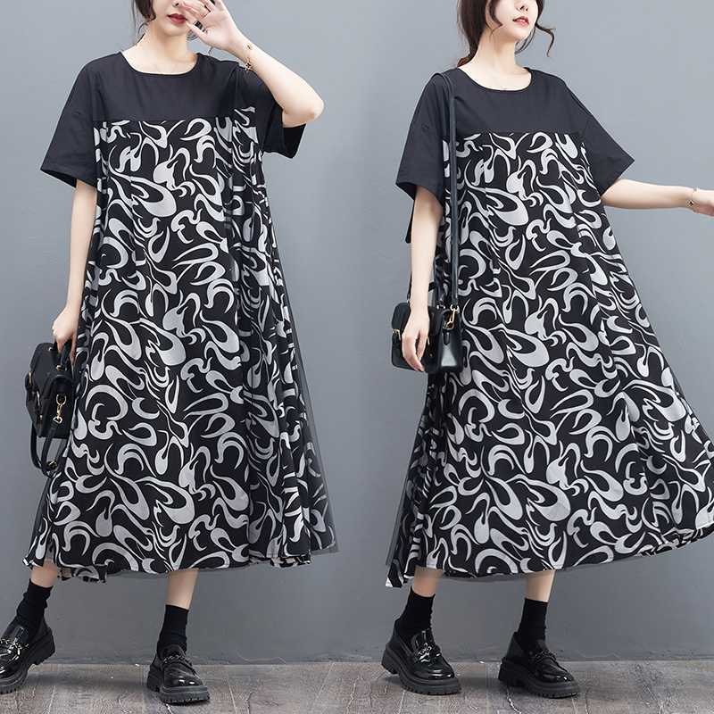 Свободное платье большого размера в стиле пэчворк из сетки с художественным принтом, с широкими рукавами и плиссировкой, стройнящее